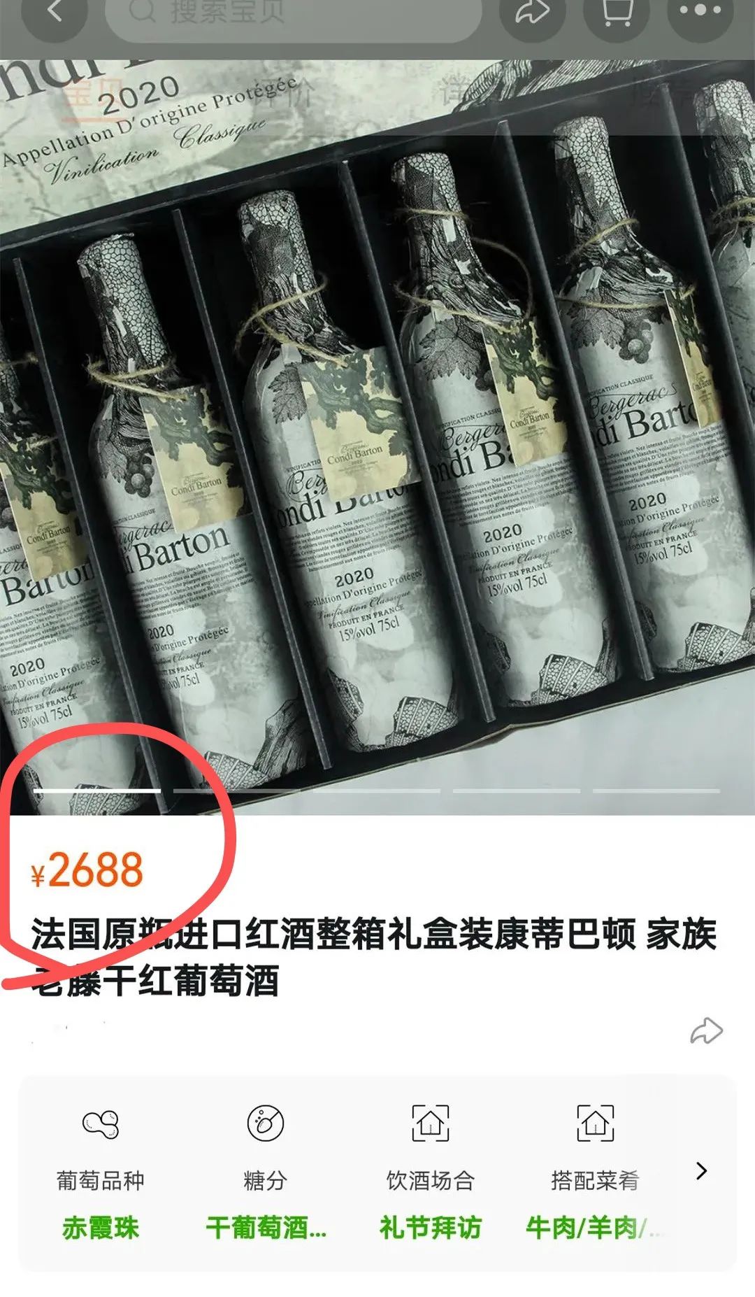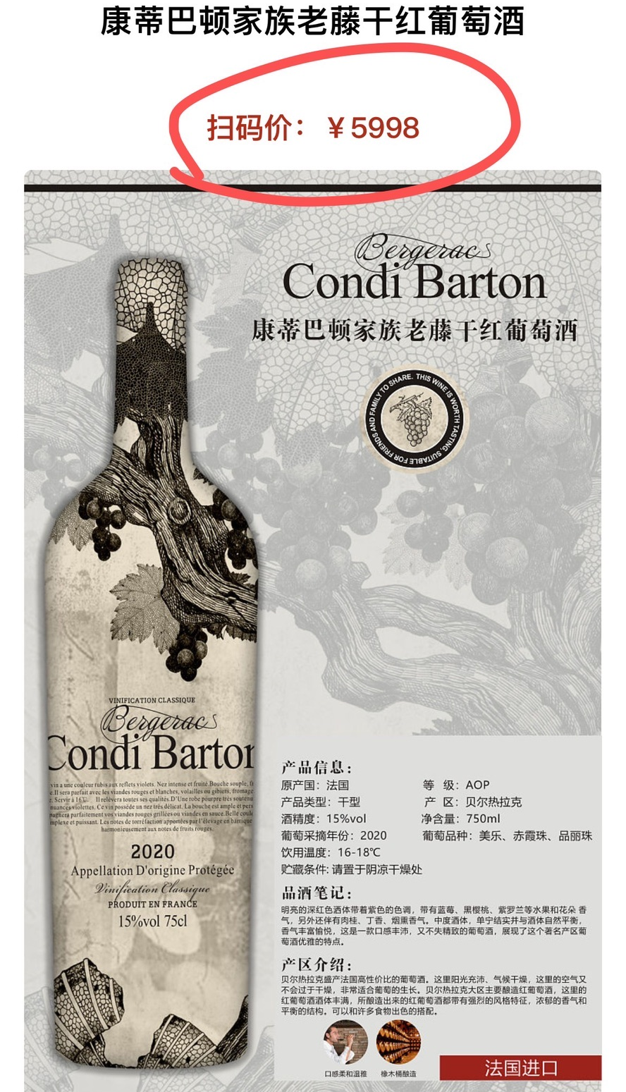 好红酒价格自然也不便宜,尤其是达到了AOP等级的!这款红酒扫码价5998,平时某猫上要2688元,价格可不便宜的!