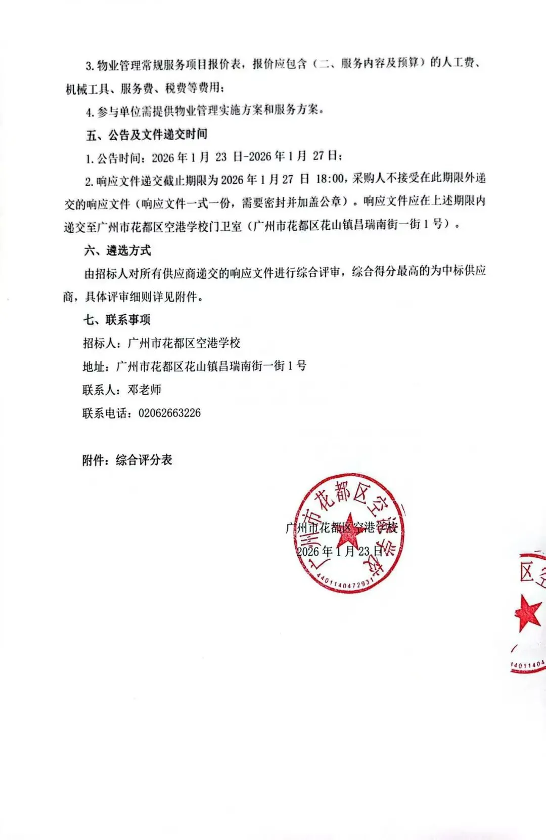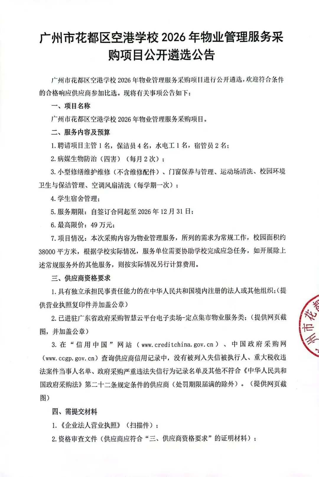 广州市花都区空港学校2026年物业管理服务采购项目进行公开遴选,欢迎符合条件的合格响应供应商参加比选。现将有关事项公告如下: