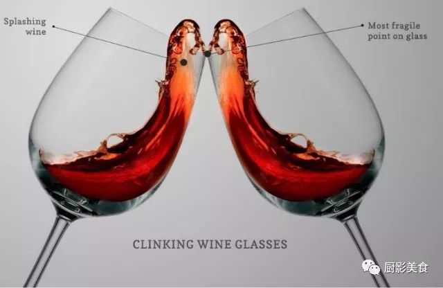 下图为最典型的错误碰杯方式,便是在碰杯时撞击杯口。这种碰杯方式第一个缺点是容易让酒液洒出;二是大家都知道红酒酒杯比较易碎,尤其杯口往往是最薄最脆弱的部分,用杯口碰杯就有很大的将酒杯碰碎的风险;三呢就是杯口相互接触,很容易产生卫生问题。