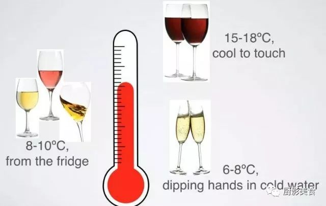 白葡萄酒的适饮温度要比红葡萄低,但不低于7℃。酒体轻盈或者中等酒体的白葡萄酒需在7至10℃的温度下饮用。而经过橡木桶熟化的中等或饱满酒体的白葡萄酒最好轻微冰镇后饮用,最佳温度为10至13℃。另外,香槟(Champagne)、卡瓦(Cava)等起泡酒需充分冰镇,使温度介于6至10℃时饮用。至于甜葡萄酒,最佳温度则为6至8℃