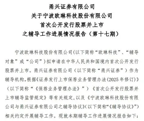 证监会网上服务平台公示信息显示,宁波欧琳科技股份有限公司(下称欧琳科技)在上周披露了首次公开发行股票并上市辅导工作进展情况报告(第十七期)。