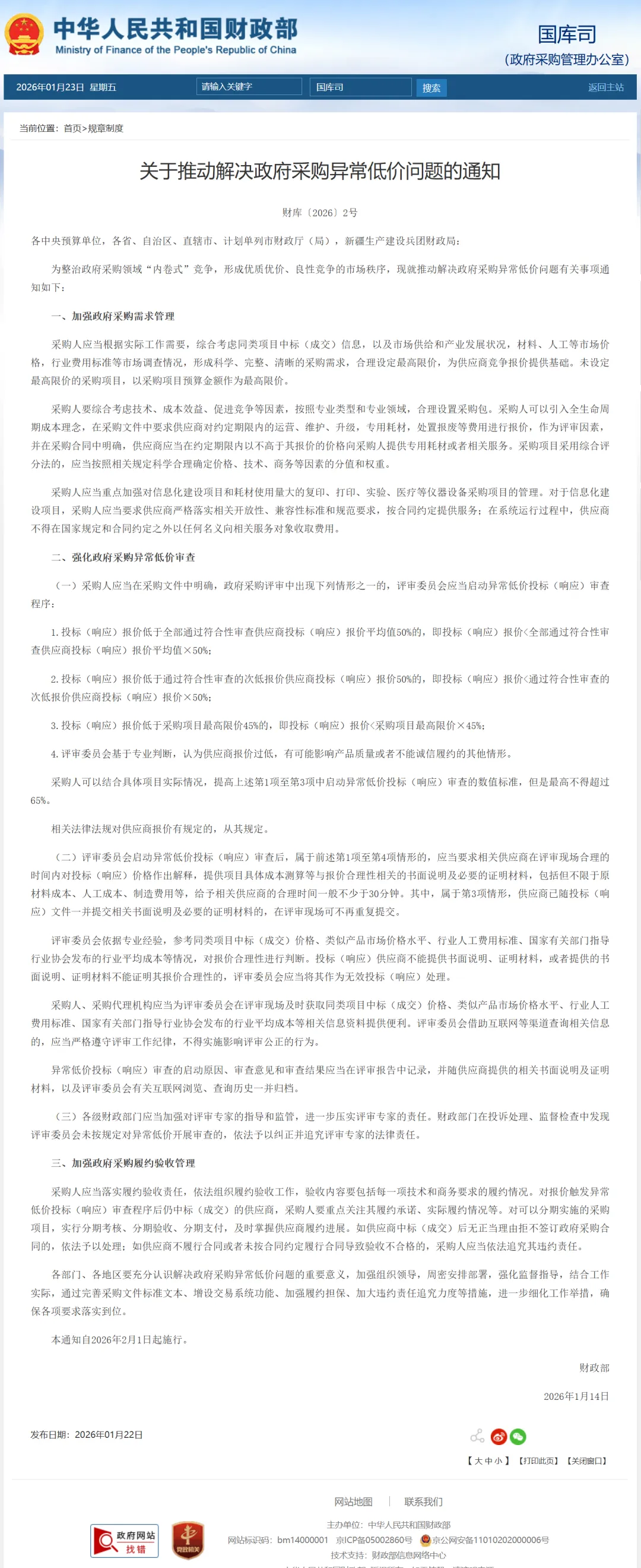 财政部整治政府采购内卷式竞争:异常低价标准明确,专家评审责任压实