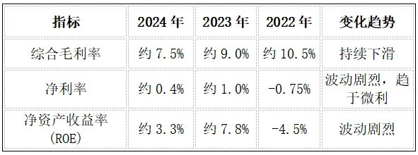 净利率微薄:2024年净利率仅为0.4%,显示公司已处于微利边缘。2025年上半年的亏损进一步证明,在当前行业环境下,公司难以通过规模效应实现稳定的高盈利。