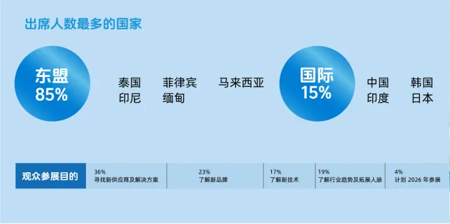 2025年展会共吸引 23,043 名专业观众到场,整体规模稳健,专业性与国际化程度并重。从地域结构来看,泰国本土观众占比达 80%,充分体现出展会在当地美容及相关产业中的高度影响力和行业号召力,是深度触达泰国核心市场与终端买家的重要平台。