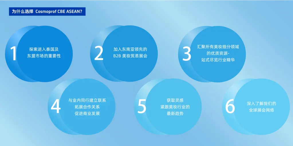 Cosmoprof CBE ASEAN 是泰国及其周边国家快速发展的美妆市场中领先的B2B 贸易盛会,同时也是进入东盟市场的重要门户。该展会汇聚了本地及国际美妆行业的顶尖专家,能为美业人士提供独家的人脉拓展机会。
