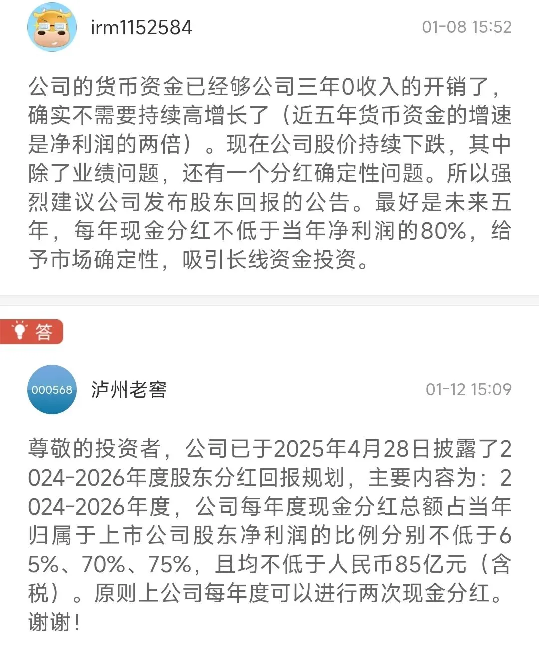 茅五泸会跟进修改分红政策吗?