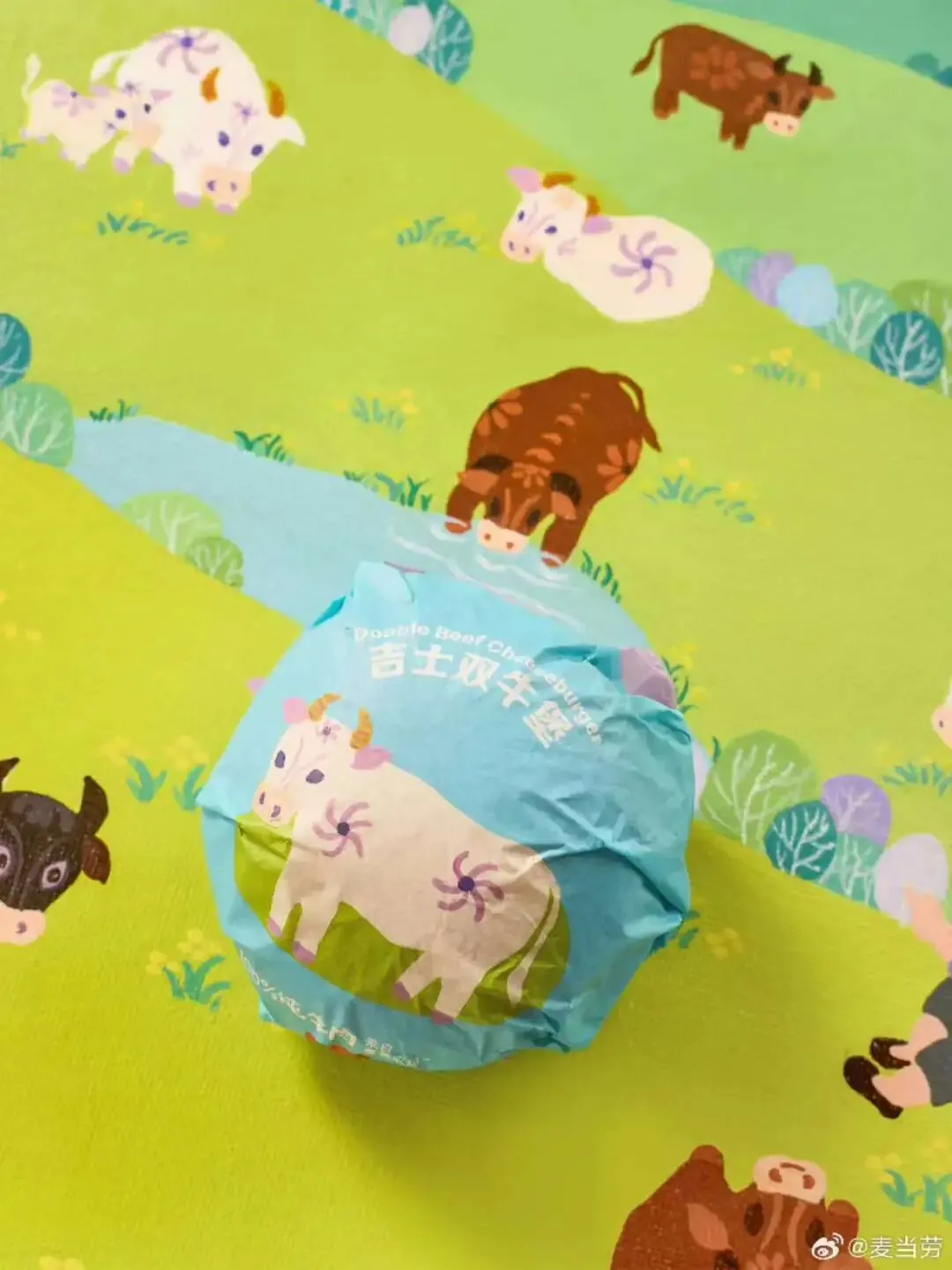 麦当劳“农情美味”主题系列设计包装画,以麦当劳牧场的牛群为原型,用农民画标志性的明艳色彩和饱满构图,勾勒出一幅生态盎然、牛群闲适的田园图景,将“环保、健康、绿色”的理念悄悄藏进了方寸画纸间。