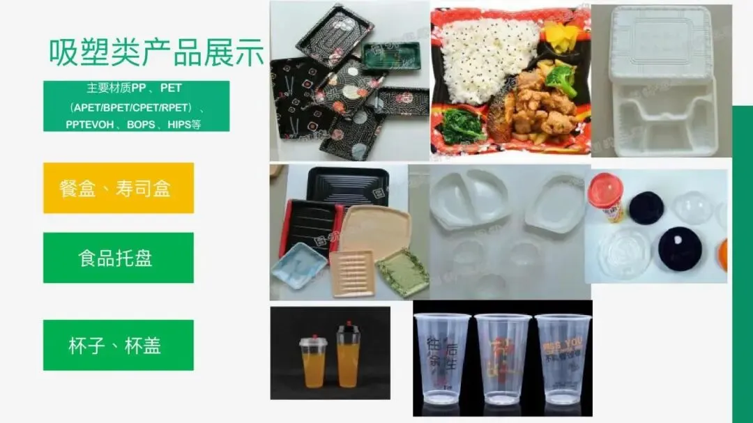 主要材质是PP(聚丙烯)、APET/BPET/CBET/RPET(聚酯)、PPT(复合聚丙烯)EVOH(高阻隔)、BOPS、HIPS、PSP等,是食品加工厂、超市、酒店、快餐业等理想的包装容器。