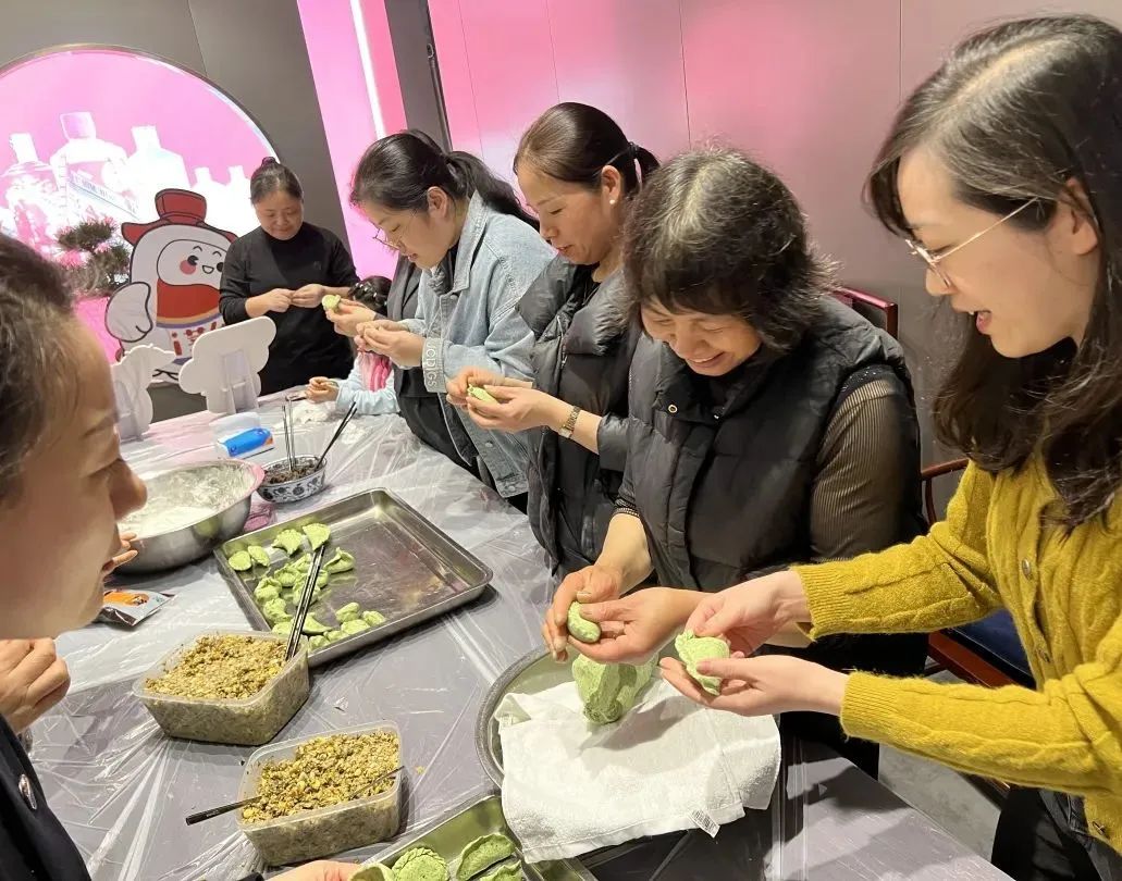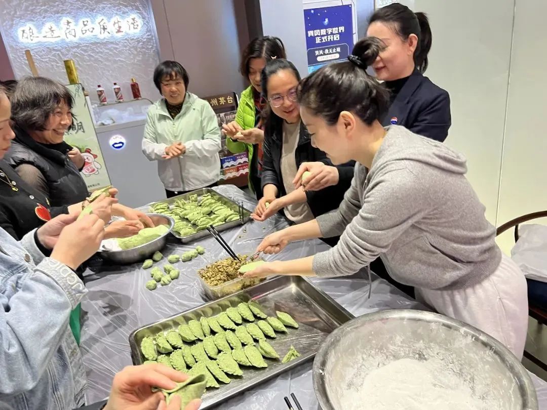 活动现场大家专注聆听、观看“专家”传授技艺,边学边做,相互取经,没一会儿,一个个俏皮可爱的清明果子都制作完成了,果子们可甜可盐,有鲜笋雪菜肉馅的、有豆沙馅的从挑选食材到制作、步步精细,就像茅台的酿造工艺一样,精益求精,只为给客户一个最优质的体验。