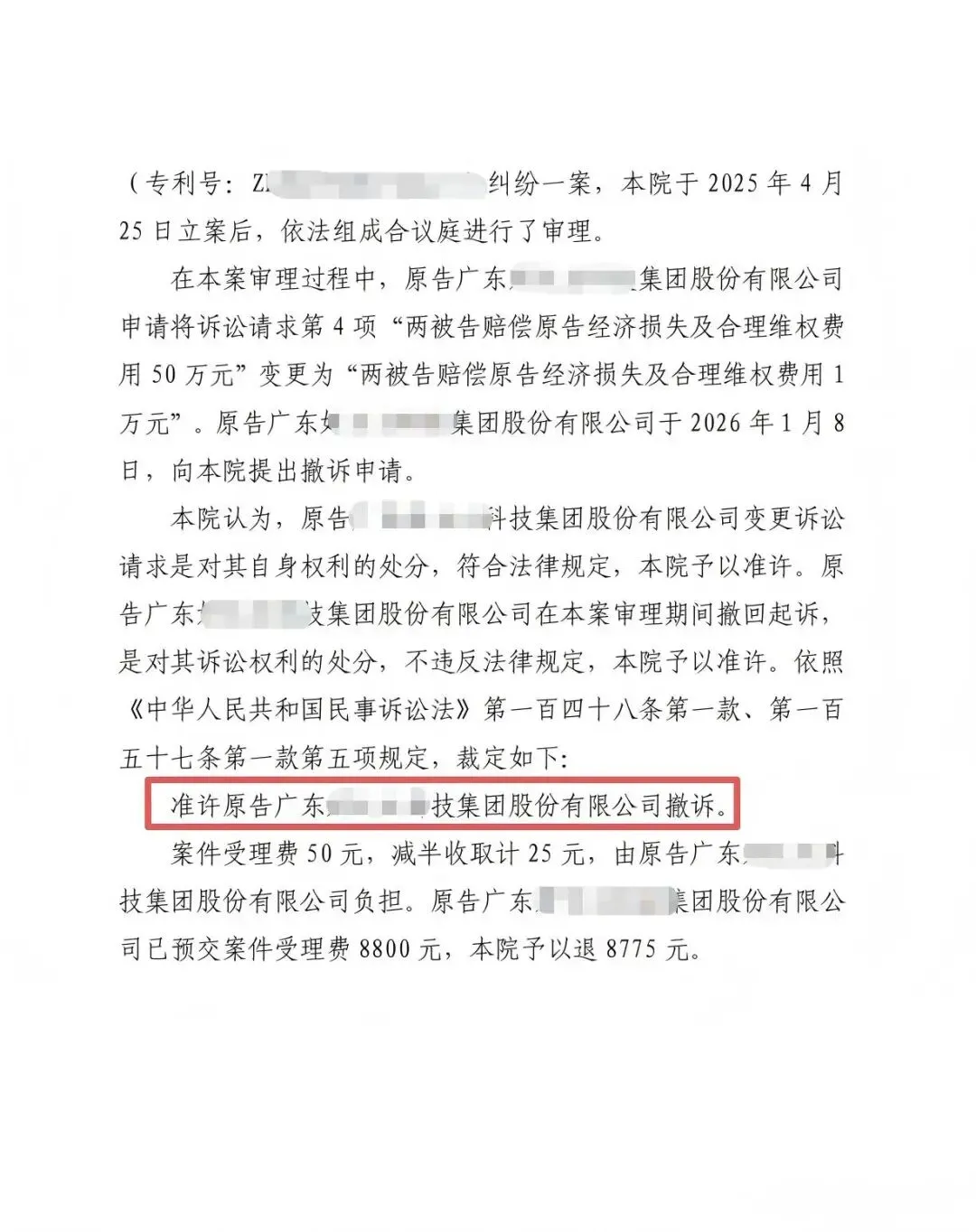 同时,专利无效程序的启动给原告带来了显著压力。随着案件推进,在扎实的证据与专业的法律论述面前,原告方权衡利弊,最终主动向法院申请撤回起诉。法院依法裁定准许,本案以原告撤诉、诉讼程序终结,委托人的合法权益得到圆满维护而告终。