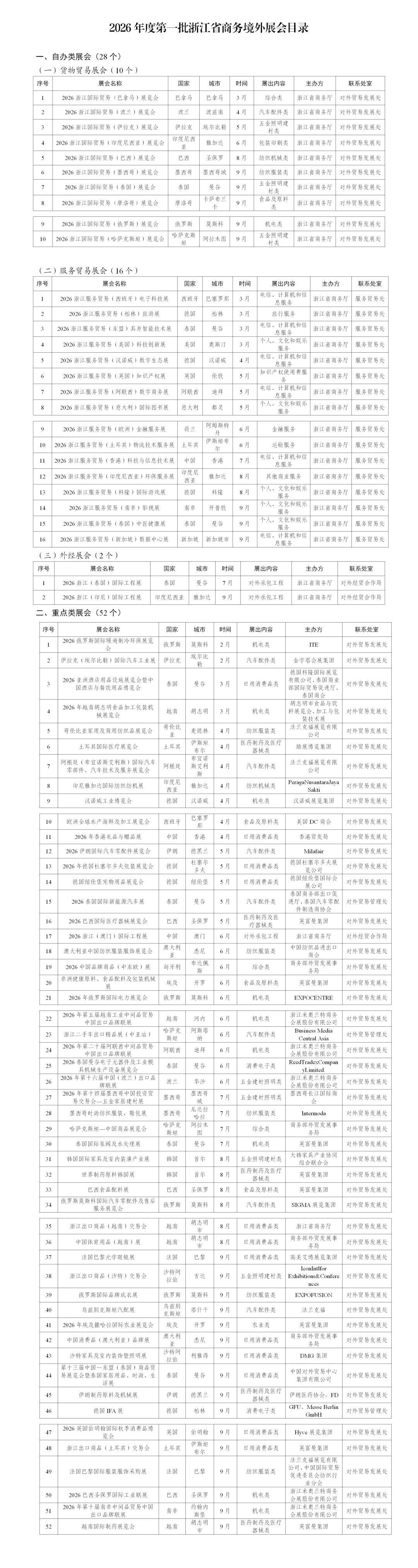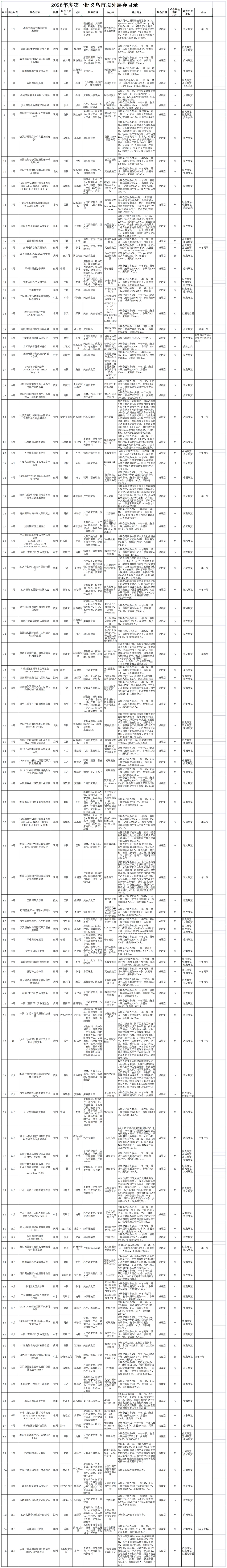 为进一步发挥好展会拓市场、增订单的积极作用,全力支持企业抢抓外贸订单,结合省商务厅有关文件及企业需求,现发布2026年义乌市境外展会支持目录。2026年境外展支持目录由省级和市级构成,省级分自办类和重点类展会,市级分成熟型(举办5年以上,200个以上展位)和培育型展会,具体目录如下: