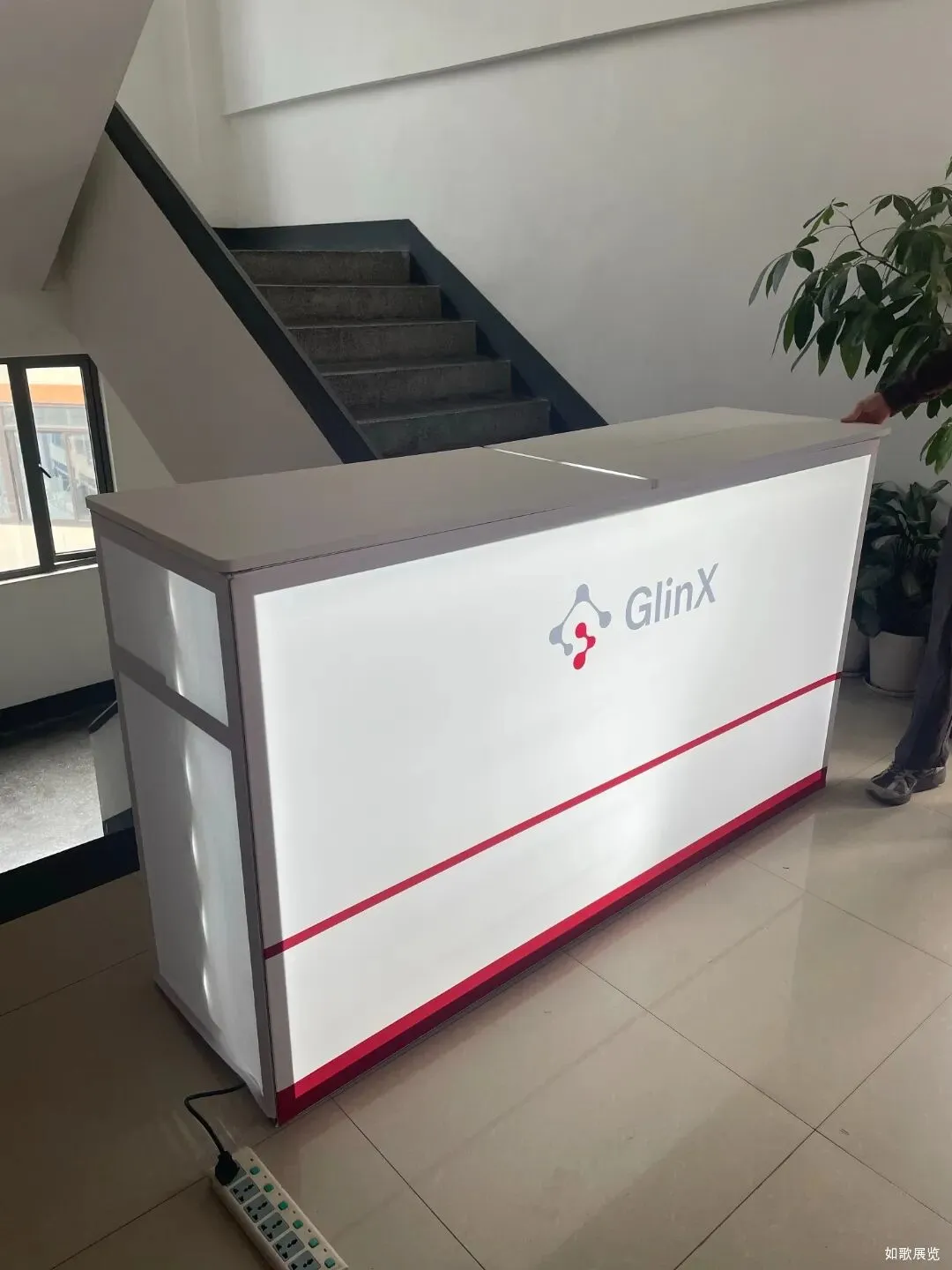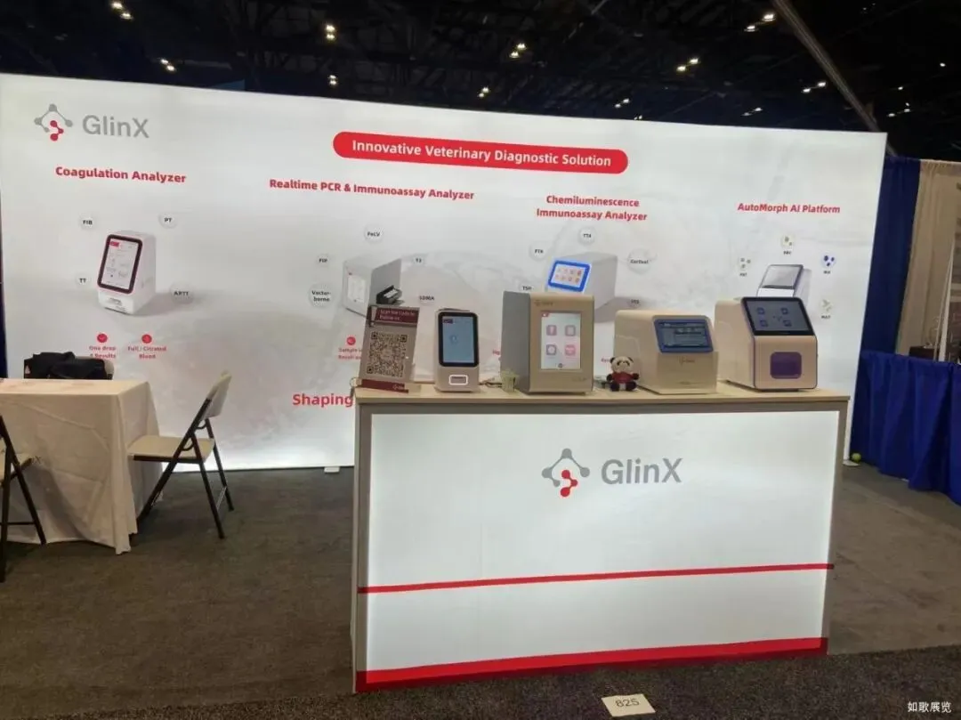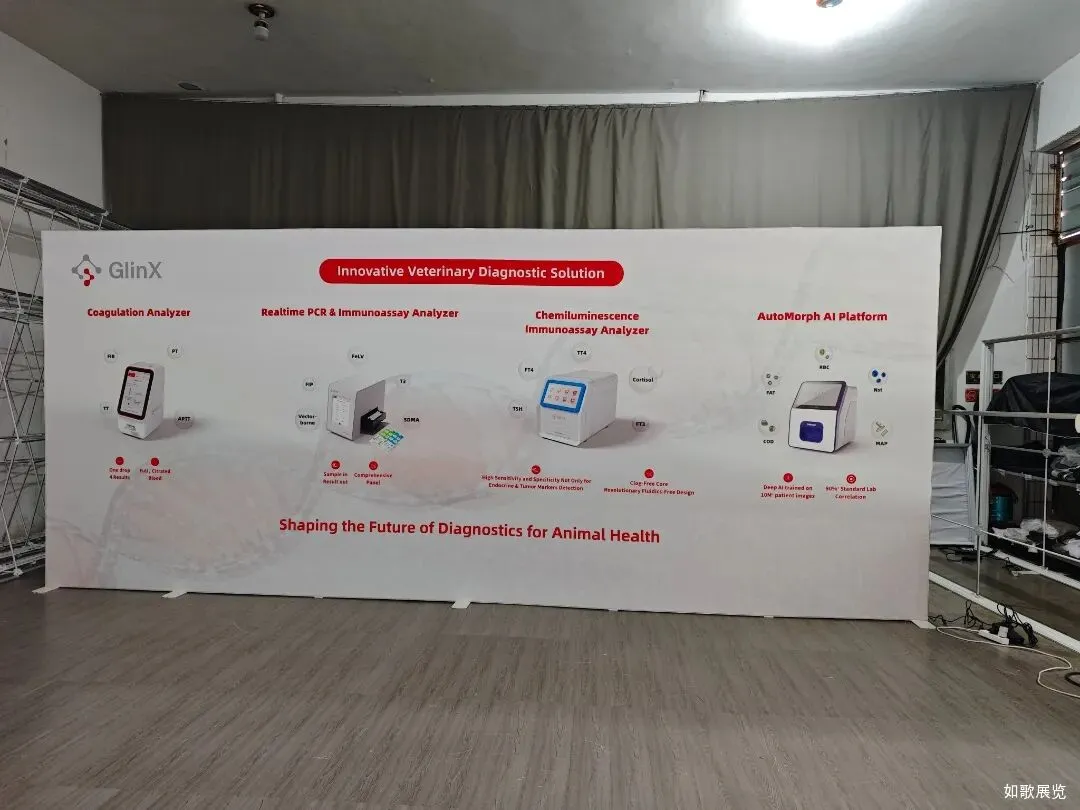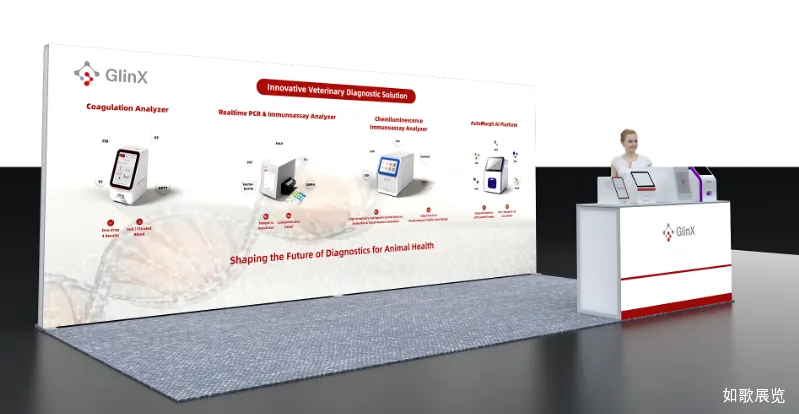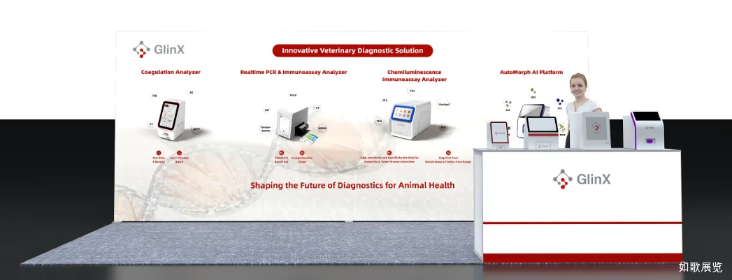 在此次展会期间,如歌展览主要负责基灵公司的展台设计及搭建一站式服务工作。展台以整面发光灯箱为核心视觉载体,采用纯白底色搭配品牌红灰主色调,通过清晰的设备分区与 DNA 链背景,既突出了 GlinX 兽医诊断解决方案的科技属性,又传递了专业亲和的品牌形象。空间上采用开放式布局,前方接待台与背景灯箱形成前后层次,既保障了观众可从多方向轻松接近,也让接待洽谈区成为自然的互动焦点,整体设计简洁高效,能够在展会中快速吸引目标专业观众并促进交流。