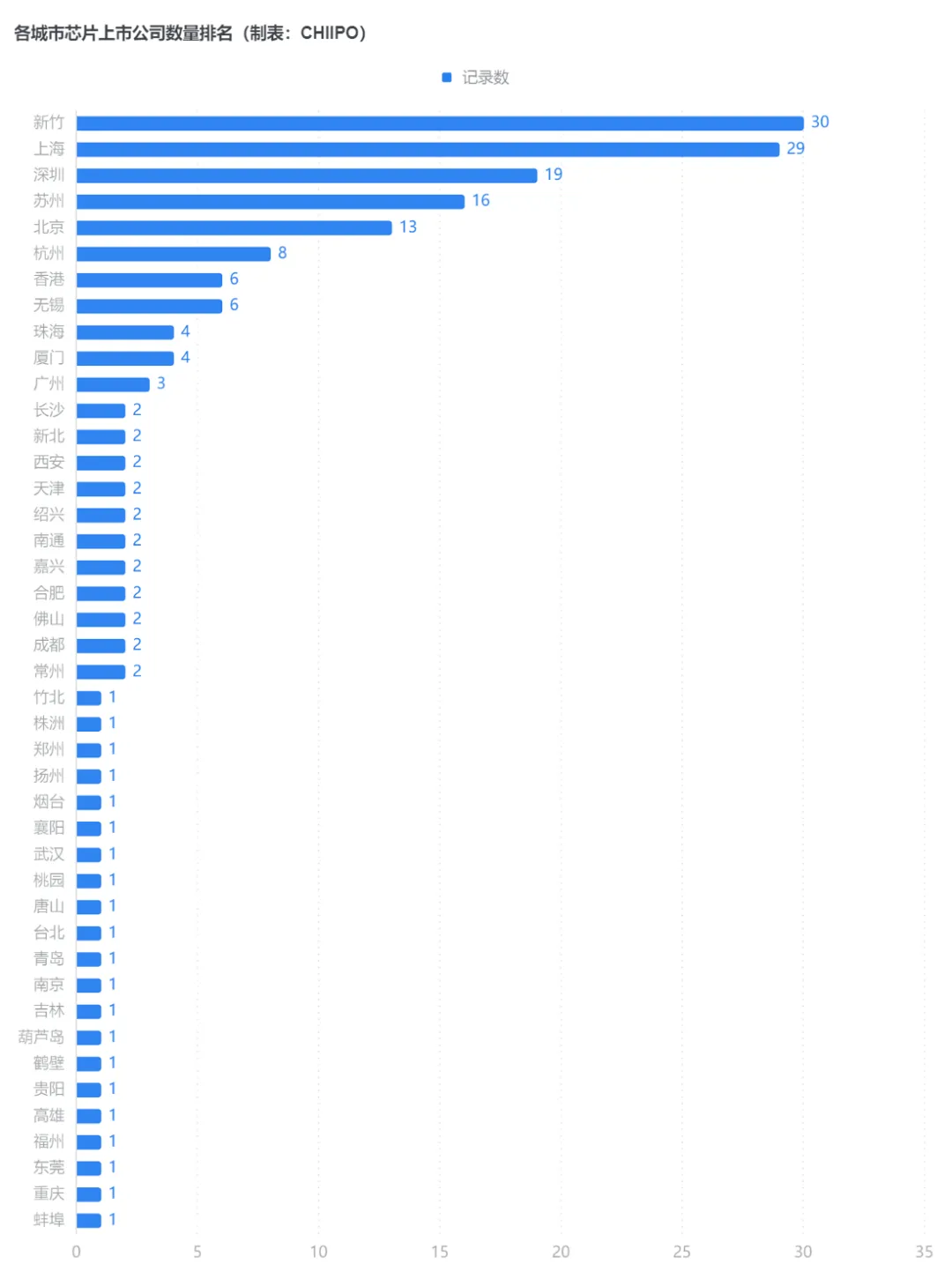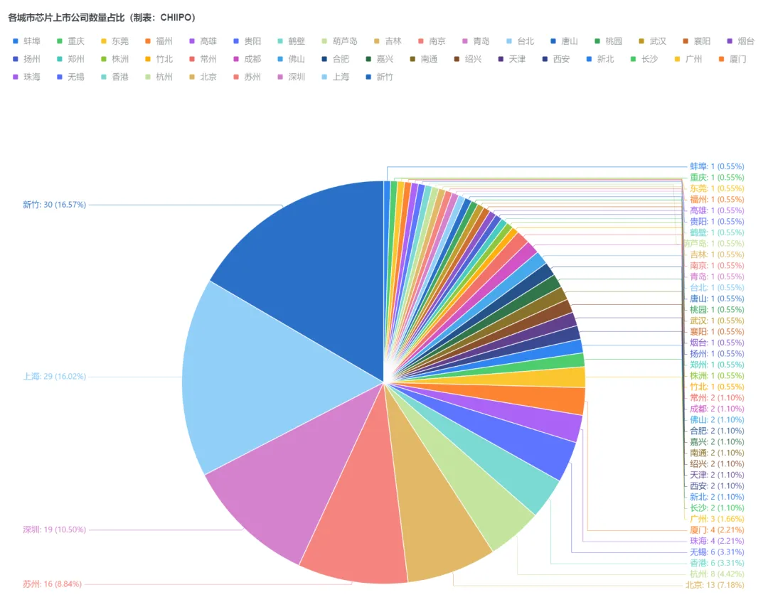 从地域分布看,新竹、上海、深圳、苏州、北京成为芯片企业最密集的五大城市,合计占比约60%。