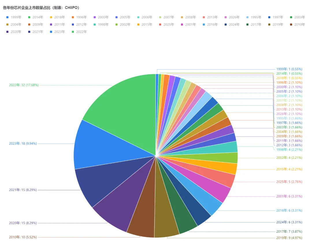 再从上市时间分布看,近三十年的上市数据中,2022年以32家成为上市最活跃的年份,2020-2023年更是集中了超半数的上市企业,标志着中国芯片产业在压力下进入了加速发展的新阶段。