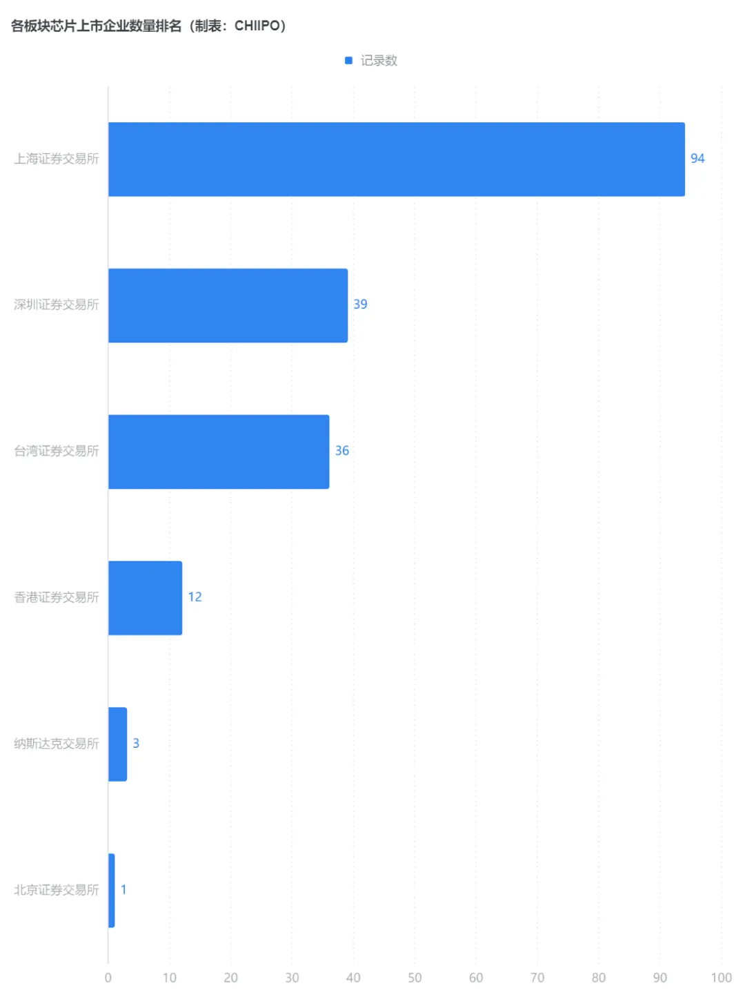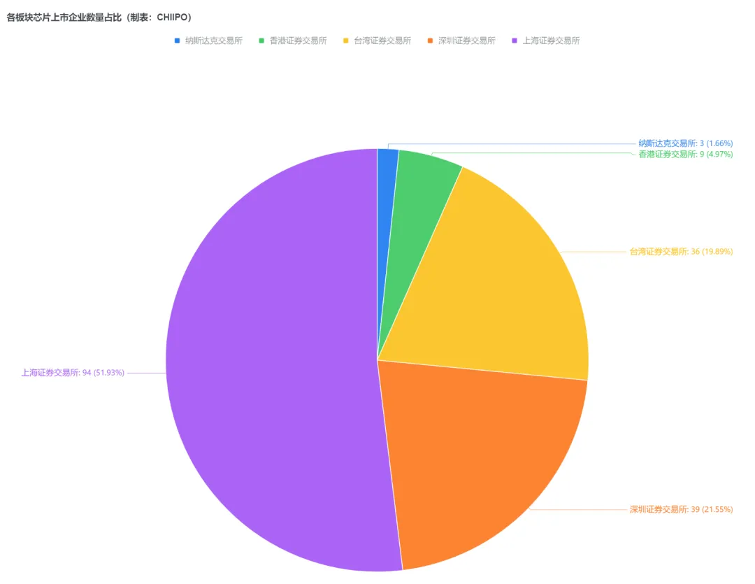 从上市板块分布看,上海证券交易所以94家企业占比超50%,成为芯片上市企业的核心阵地,深圳、台湾、香港交易所紧随其后。这一结构反映出A股市场对芯片产业的强力支撑,也体现了不同资本市场的定位差异与资源倾斜。