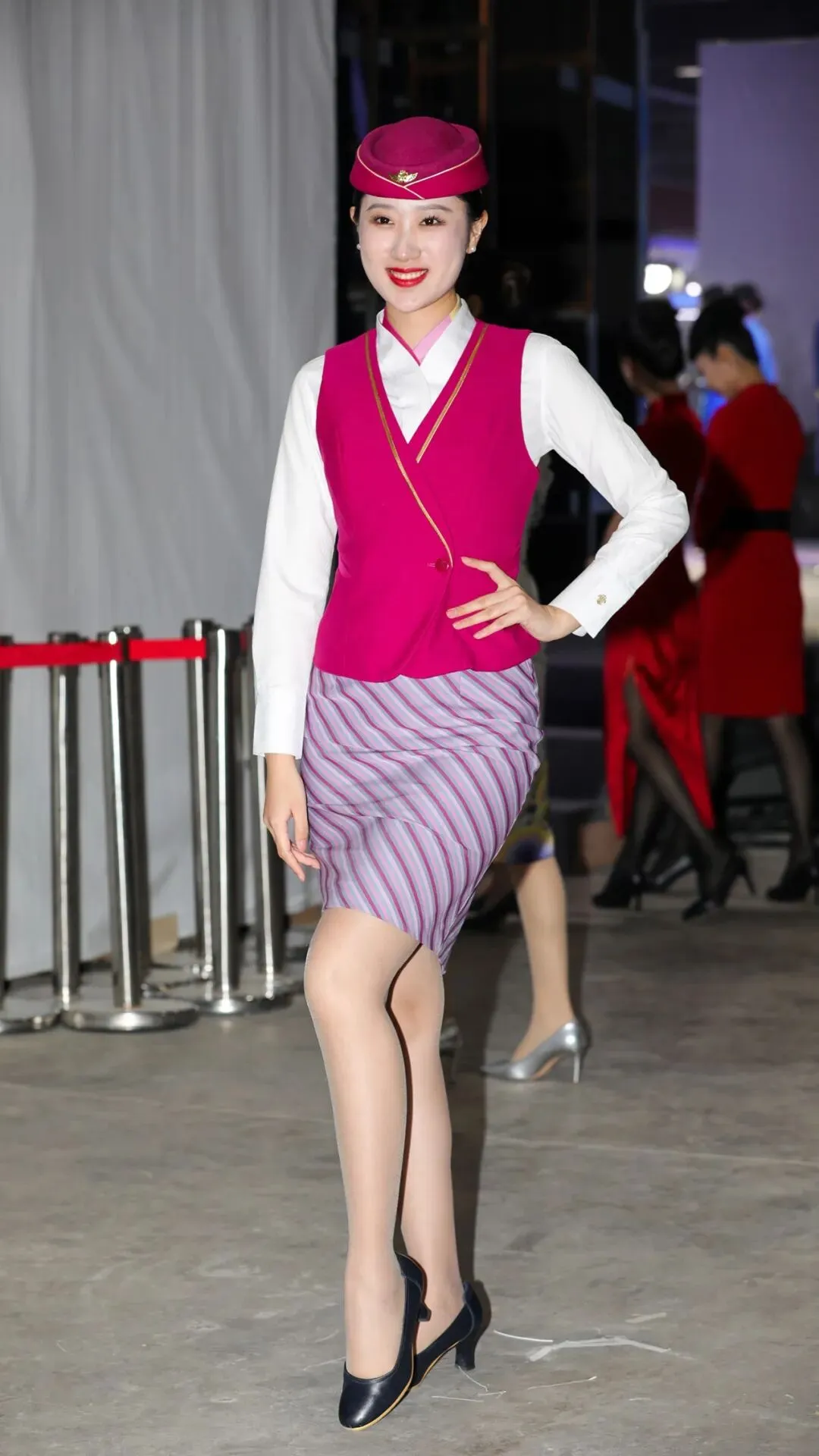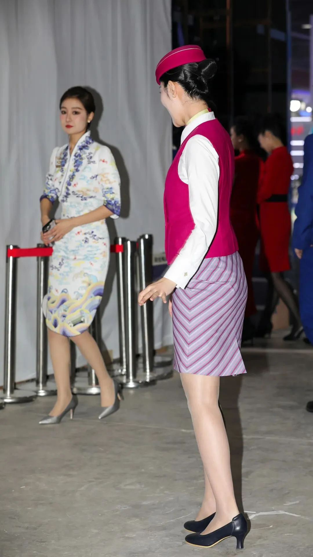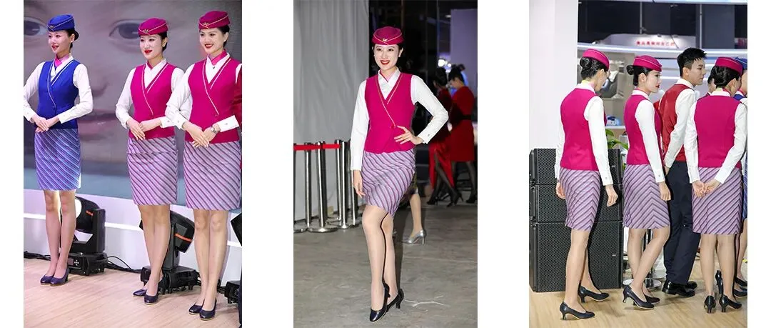 一旁的蓝色制服则多了份沉稳,条纹裙装以蓝红相间的纹路呼应南航品牌色,搭配同色系贝雷帽,专业感里透着时尚度。更惊艳的是旗袍式制服:玫红缎面裹着典雅立领,侧边开叉处的金边绣线,把中式美学与航空优雅揉在一起 —— 这场 “制服秀”,本身就是展会的核心看点。