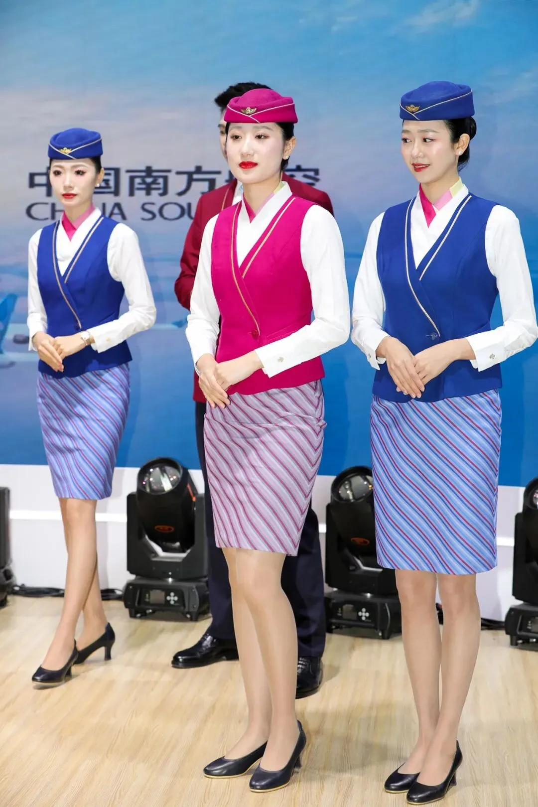 台上的空乘制服,是南航品牌气质的具象化表达。有的空乘身着玫红色背心式制服:白色衬衫衬出利落肩线,领口粉色丝巾轻轻垂落,背心边缘的金边线条像机翼的流线型设计,既显精致又暗合航空属性。