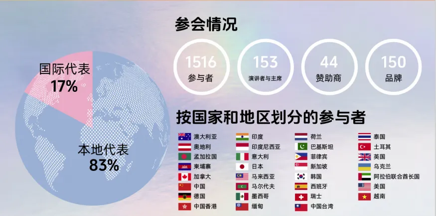 从规模维度看,2024年AMSC马来西亚站共有1516 名参与者、153 位演讲者、44 家赞助商及 150 个品牌的参与,印证了会议已具备相应的行业规模与影响力;从地域属性而言,本地代表占比达 83%、国际代表占 17%。