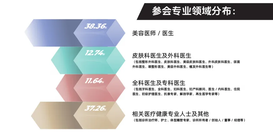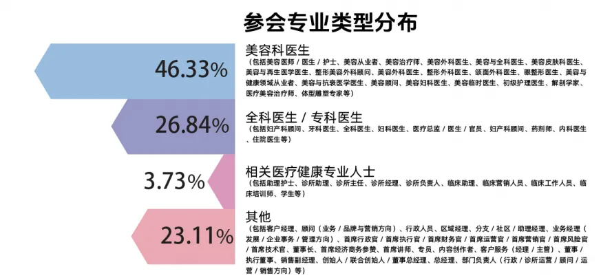 从参会群体的专业构成可清晰把握会议的定位与覆盖维度:美容科医生以 46.33% 的占比成为最主要参会群体,直观体现出本次会议聚焦美容医疗领域的核心导向;全科 / 专科医生占比 26.84%,作为第二大参会群体,说明会议同时覆盖了基础医疗从业者群体;仅 3.73% 占比的相关医疗健康专业人士,则属于本次会议的小众参会群体。