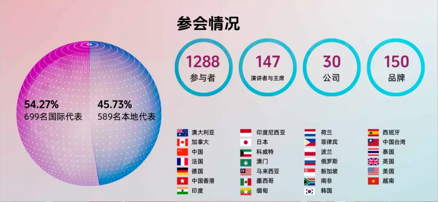 从规模维度上,2024年AMSC香港站共有1288 名参与者、147 位演讲者、30 家公司及 150 个品牌的参与,体现出会议具备可观的行业参与度,品牌数量保持稳定;地域属性方面,国际代表占比达 54.27%(699 名)、本地代表占 45.73%(589 名),说明会议的国际辐射度较广。