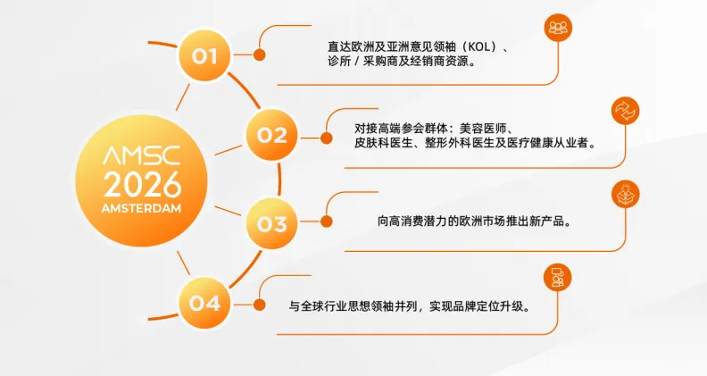 会议面向欧洲与亚洲市场,将帮助企业一站式触达两大区域的核心KOL、诊所、采购商及经销商资源,并精准对接美容医师、皮肤科与整形外科专家等高端专业群体。同时,这也是将新品推向高消费潜力的欧洲市场的最佳平台,使品牌能够与全球行业思想领袖同台展示,从而全面提升行业影响力与品牌定位。