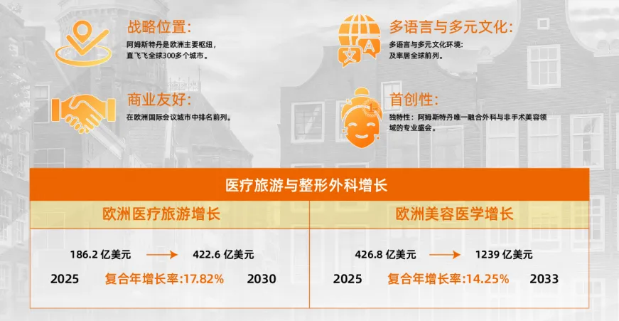 阿姆斯特丹美容医学与外科大会暨展览会是AMSC继香港与马来西亚站新推出的欧洲地区美容医学与外科大会。AMSC是连接外科美容与非手术美容复杂领域的关键桥梁。会议将汇聚多元专业知识与视角,共同提升患者护理质量、精进诊疗技术,并探索重新定义行业未来的突破性技术。