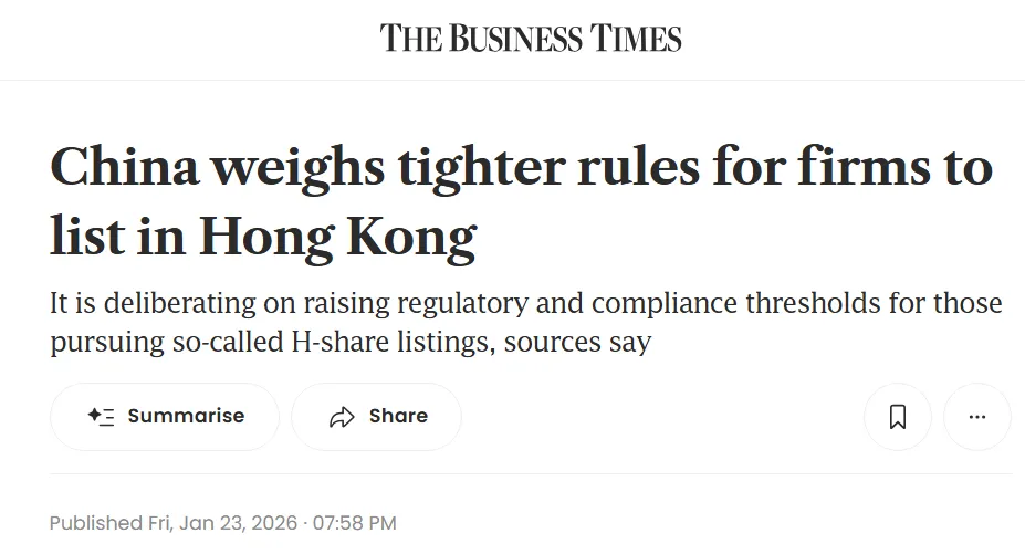 1月23日,《商业时报》报道称,中国证监会正考虑收紧内地企业赴港上市的审核标准,以应对近期境外融资热潮中出现的交易质量下滑的担忧。据报当局拟提高监管及合规门槛,包括设定最低市值限制。