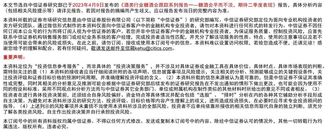 次高端:我们认为随着经济活动的复苏,次高端渠道动销速度恢复,企业倾向于动态调整以平衡业绩和动销,看好在300-500元价位段价格拥有消费者培育能力的企业。