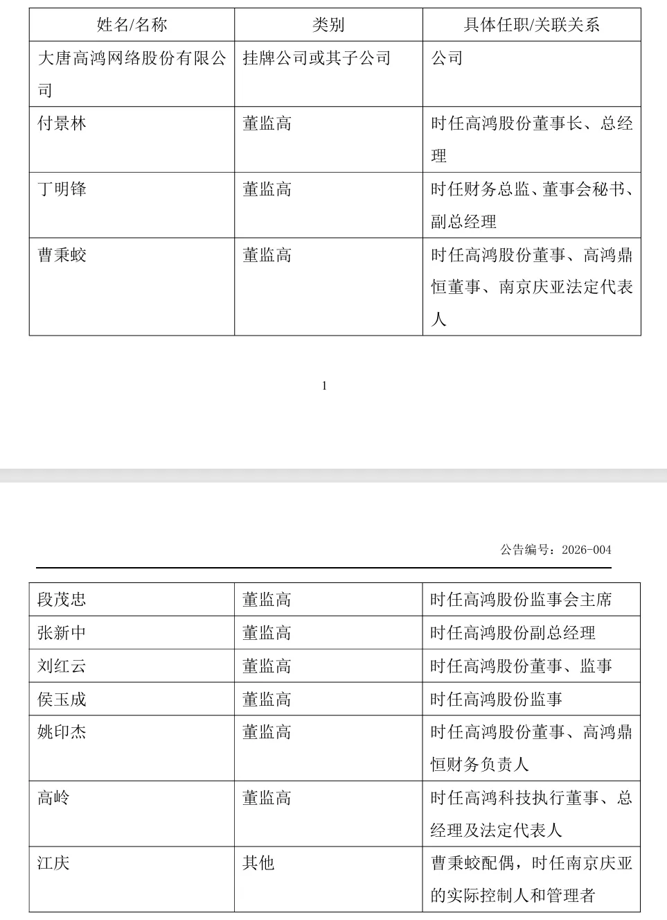 在涉案期间,付景林任高鸿股份董事长、总经理等职务,丁明锋任财务总监、董事会秘书、副总经理等职务,二人未勤勉尽责,是高鸿股份上述违法行为直接负责的主管人员。曹秉蛟任高鸿股份董事、高鸿鼎恒董事、南京庆亚法定代表人,段茂忠任高鸿股份监事会主席,张新中任高鸿股份副总经理,刘红云任高鸿股份董事、监事,侯玉成任高鸿股份监事,姚印杰任高鸿股份董事、高鸿鼎恒财务负责人等职务,上述人员未勤勉尽责,是其他直接责任人员。