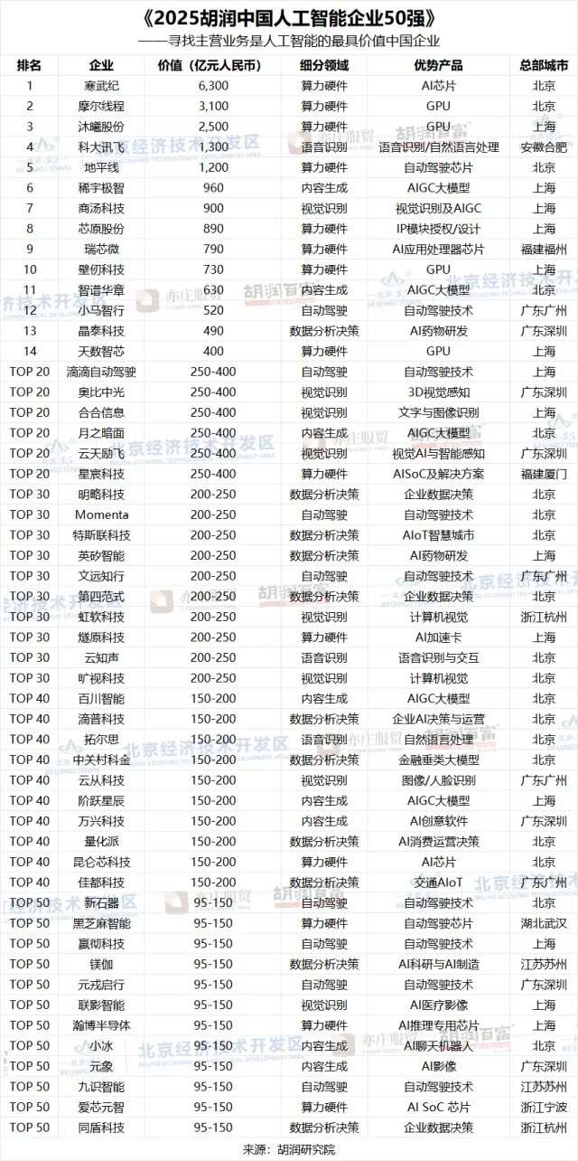 1月19日,胡润研究院发布《2025胡润中国人工智能企业50强》,深圳和广州分别有6家和4家企业入选,两地合计占据榜单的20%。