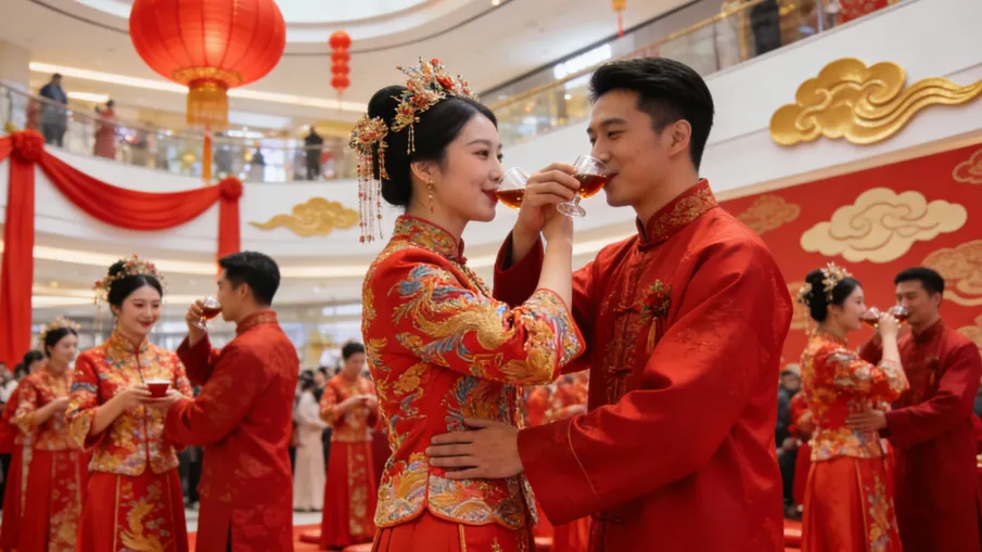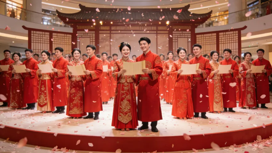 33对新人共赴仪式现场,在万众见证下完成三拜礼、夫妻结发、交杯酒、爱情宣誓等经典环节,用简约而隆重的形式定格相守承诺!