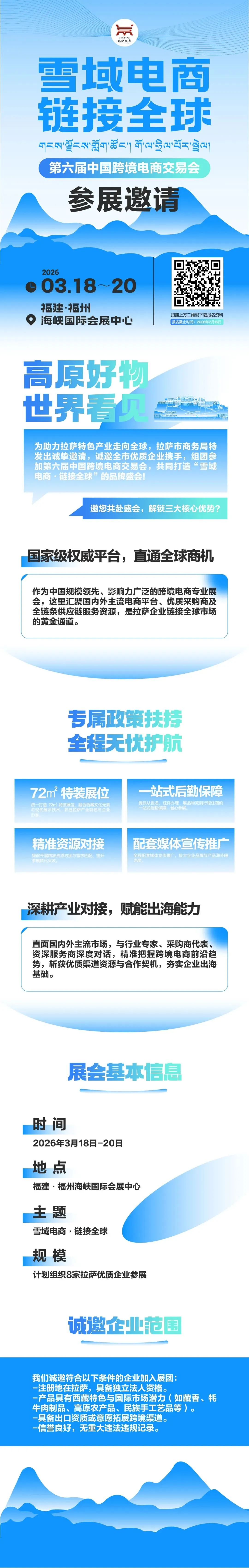 第六届中国跨境电商交易会将于2026年3月18日至20日在福州海峡国际会展中心举办。为助力拉萨特色产业走向全球,拉萨市商务局特发出诚挚邀请,诚邀全市优质企业携手,组团参加第六届中国跨境电商交易会,共同打造“雪域电商·链接全球”的品牌盛会!