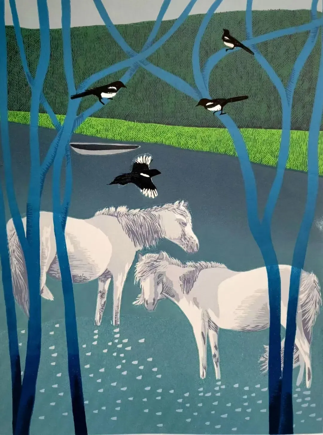 版画《徐徐春风》宛如一首灵动的诗篇。画面中,马踏清波,似光阴缓驻,流淌出静谧悠然;鹊鸣翠梢,如吉光片羽,点亮寻常日子。创作者借生肖元素,巧妙勾勒出祥瑞之景,更以碧水绿风传递出万物与时光坦然相映的深邃哲思。那饱含吉祥的生机,似潺潺溪流,淌过岁月河床,润泽人心。观此画,能真切感受到生命清澈奔腾的力量,以及衔喜而来的轻盈美好。它不仅是一幅视觉佳作,更是一份对生活的美好期许,让人在欣赏中收获温暖与力量。