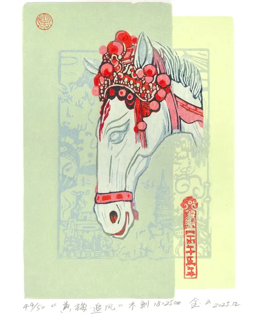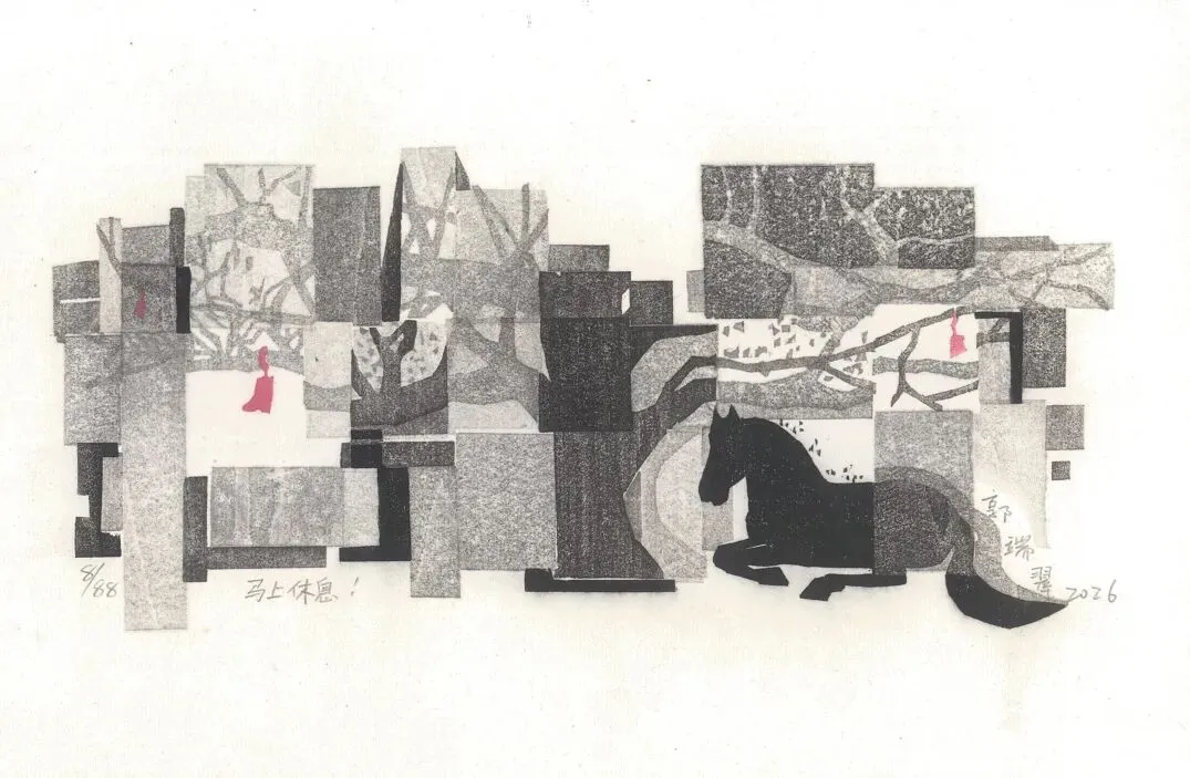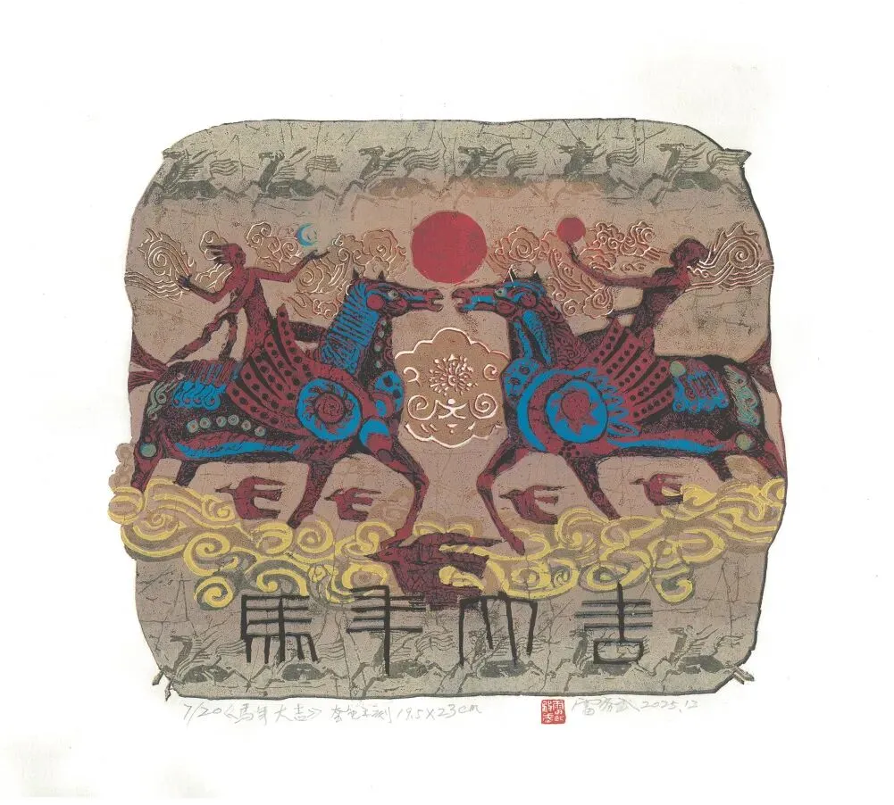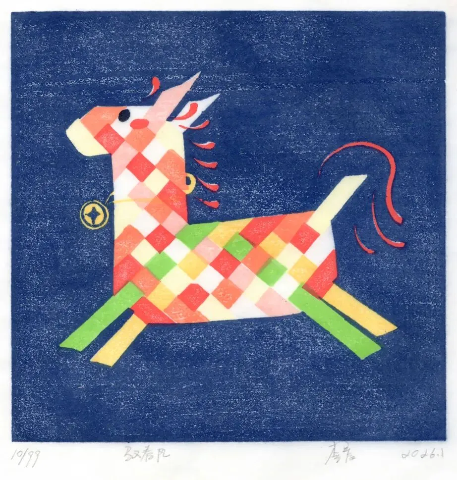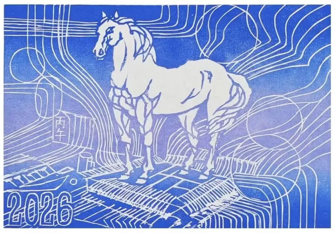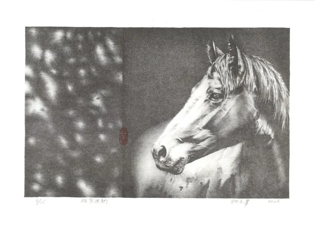 作品以马为核心意象,锚定2026丙午马年的贺岁主题,将传统生肖文化与版画艺术语言相融合,借石版画独特的肌理质感,传递辞旧迎新的美好期许。
