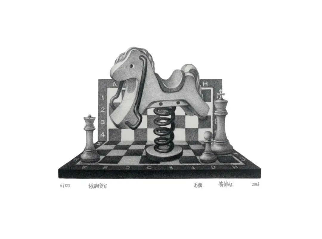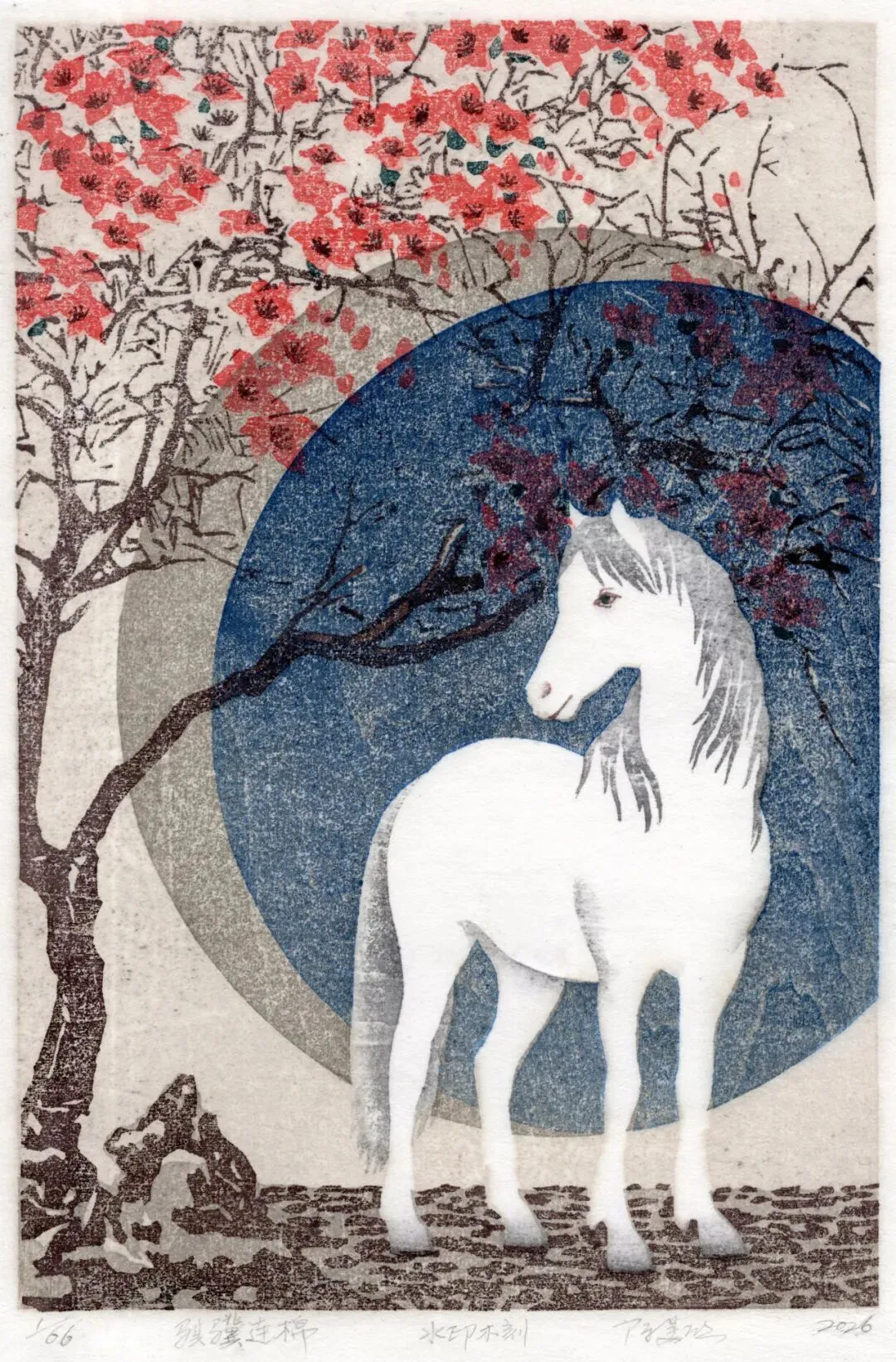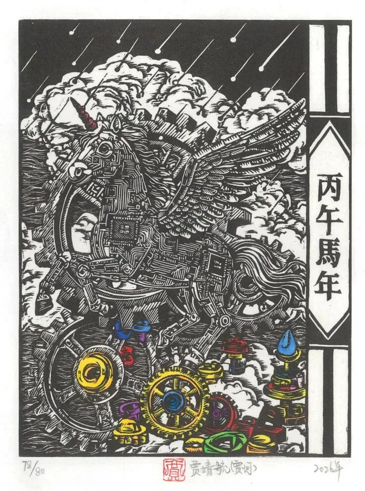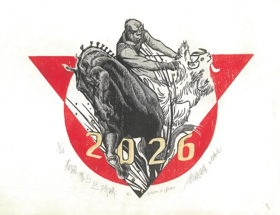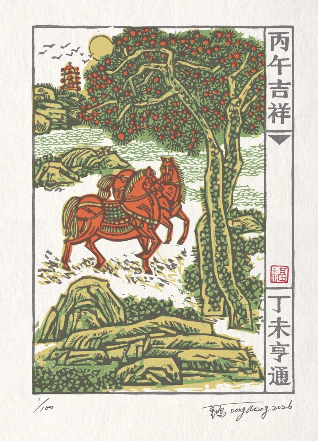 作品以马为核心意象,锚定2026丙午马年的贺岁主题,将传统生肖文化与版画艺术语言相融合,借石版画独特的肌理质感,传递辞旧迎新的美好期许。