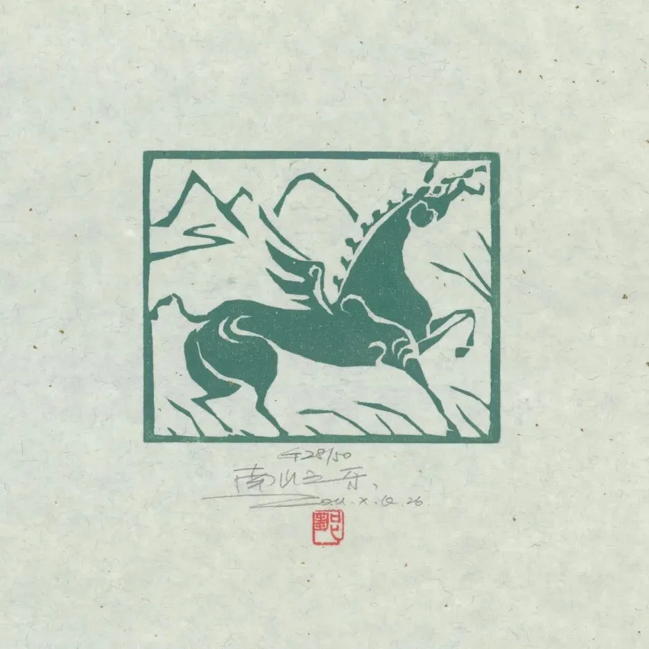 构图上,奔马占据视觉中心,线条舍弃写实描摹,以夸张的曲线勾勒出马匹昂首扬蹄的动态,鬃毛与尾羽的折线处理强化了奔腾的张力;背景的南山以极简的几何轮廓呈现,棱角分明的山形与马匹柔婉的体态形成刚柔对比,既保留木刻版画的刀刻质感,又借拼贴式的平面构成营造出超现实的空间层次。