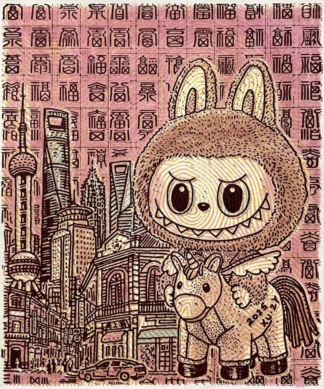 作品以骑马的拉布布为前景,背景是上海都市的地标景观,远景以百福点缀。拉布布(LABUBU)作为泡泡玛特旗下知名 IP 形象,以圆滚滚身材和无辜大眼睛为特点,性格古灵精怪又软萌可爱,通过多变造型和丰富表情传递治愈力量,深受大众喜爱。作品在表现手法上运用凸版套色和手绘,通过可爱骏马和网红潮玩形象为奋斗中的大众传递艺术治愈,祝愿每一位努力的大众在现代都市的勃勃生机中,勇立潮头、奋进向上,一马当先,阅尽摩都繁华,所愿皆成,