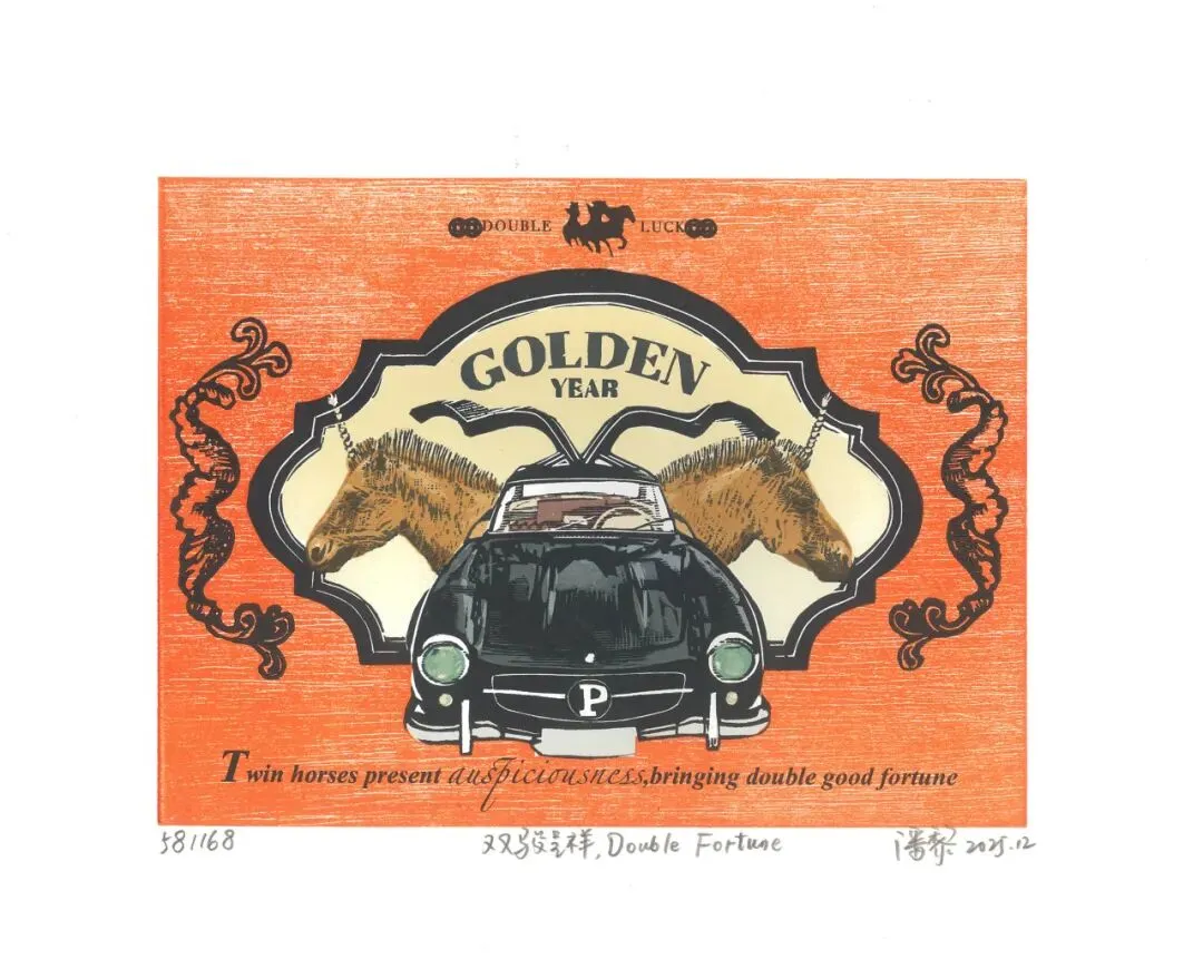 作品以双骏相向而立,像两道并行的光,守在岁首的风口,把新年的好消息提前点亮。橙红底色铺开一片暖意,层层擦印的肌理轻轻起伏——仿佛时间被揉进纸里,祝福因此有了可触摸的温度。画面中央的车头,是“启程”的隐喻:愿您把旧岁的尘埃安放在身后,把新的愿望稳稳装载,迎着风,向前行。两马一左一右,如门神、如对联,也如命运的回声——把“成双”写得响亮:好事成双、喜乐成双、福运成双;您所盼的、您所爱的,都在同一条路上相遇,愿双倍的顺遂落在你手心,双倍的欢喜落在您眉间——双骏呈祥,双倍好运,正向您奔来。