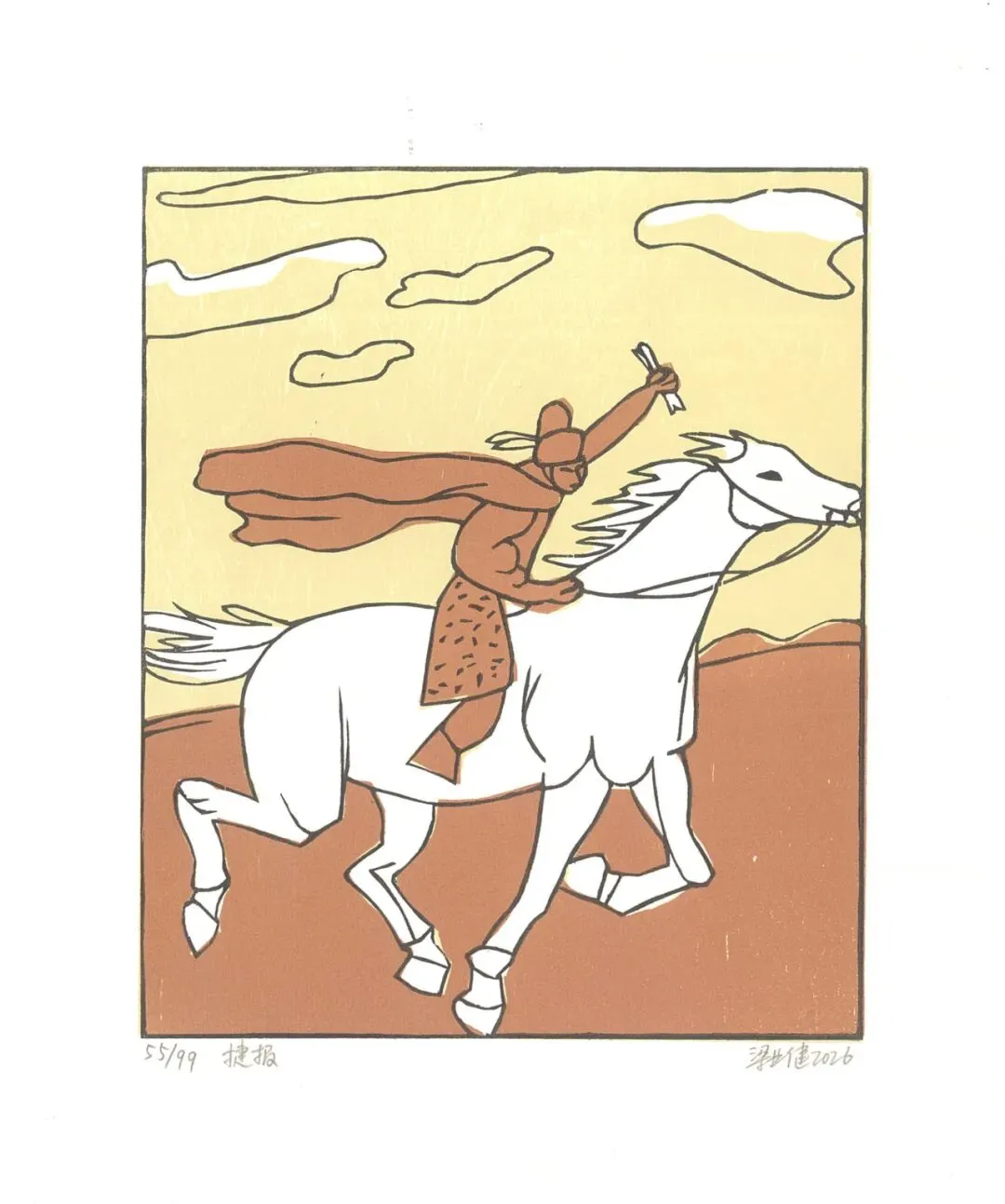 梁业健《捷报》 套色木刻 18×15cm 2026年