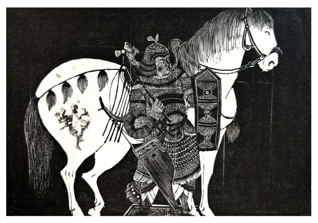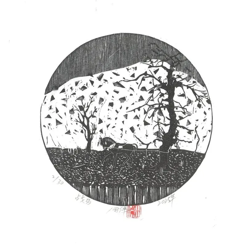 作品《战马》以圆形构图呈现,通过黑白对比与线条肌理塑造场景。“战马”既呼应马年生肖意象,又以版画的厚重感传递坚韧奋进的精神,是传统生肖文化与现代艺术语言的结合。