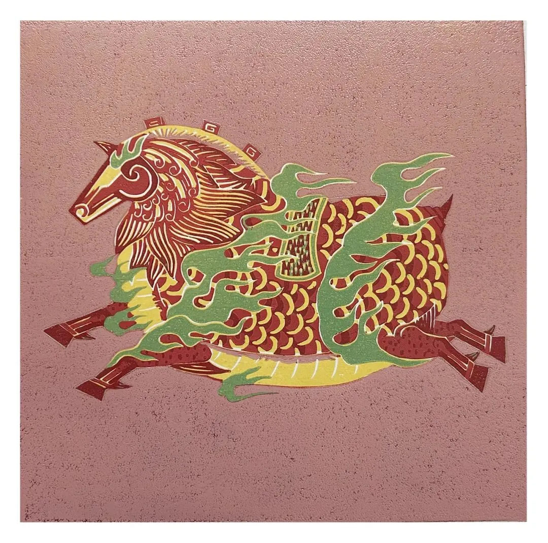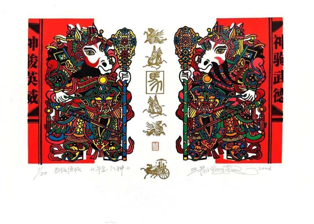 作品以传统门神文化为基,融入午马元素,塑造神骏英武、神驱武德的马面门神形象。采用绝版套色技法,通过多层色彩叠加,展现丰富视觉层次与浓烈民俗风格。画面辅以马纹、马车等符号,既传承门神护宅寓意,又借马的灵动与力量,传递祥瑞安康、昂扬奋进的精神,是传统民俗与版画艺术的创新融合。