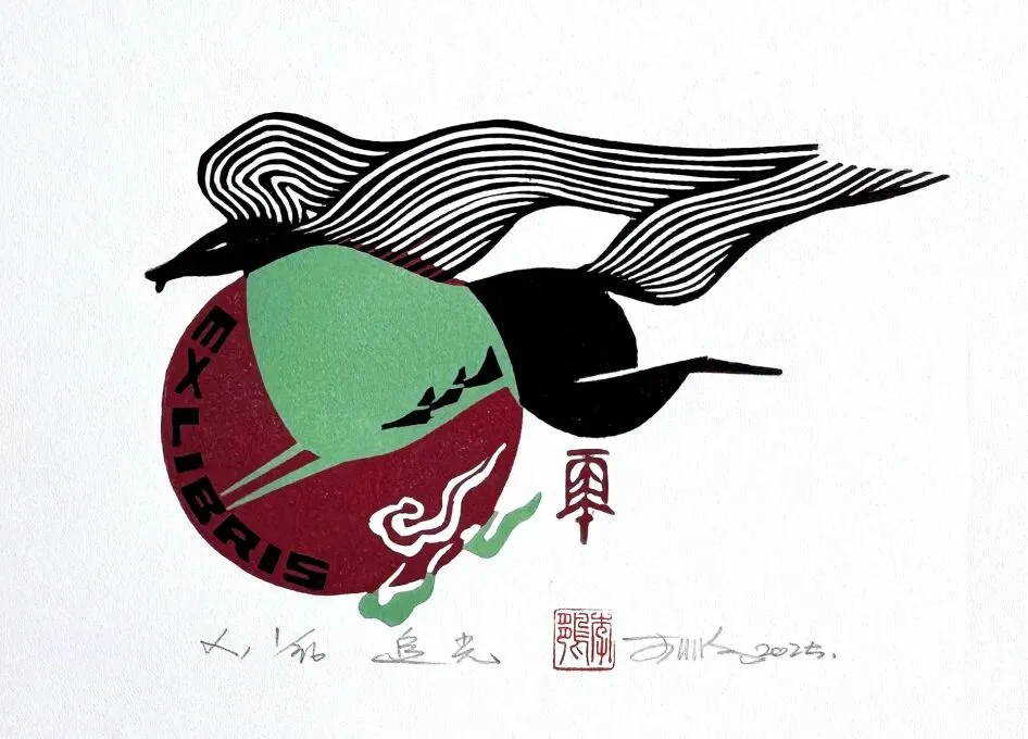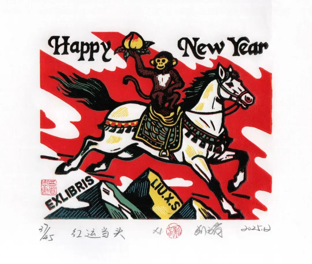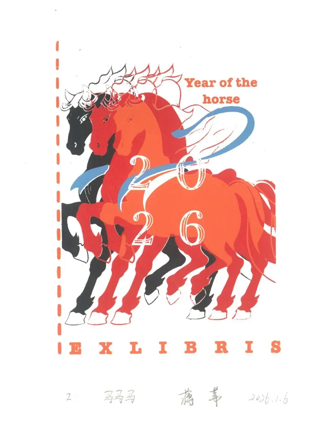 以丝网版画为媒介创作的《马马马》藏书票,将生肖马的灵动与力量凝于方寸之间,成为新年艺术收藏与视觉表达的别致选择,作品以“马年”为核心,奔马群像为核心视觉元素,画面中红黑主色调的马匹错落奔跃,线条简练却精准勾勒出骏马的肌肉线条与动态张力,蓝色彩带的点缀则为画面注入轻盈的韵律感,打破了传统生肖题材的视觉定式,既凸显了马的矫健奔放,又契合生肖马的吉祥寓意。