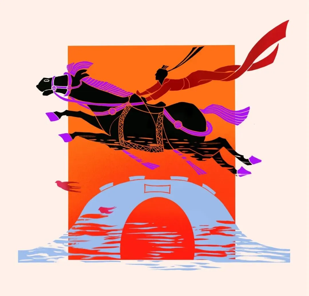 马背上的红衣男子用一抹抹炽热的红,象征着生命、喜庆与驱散严寒的春讯。桥下流水是江南大运河脉,以细密线条刻出波纹,呼应着上方的动势,仿佛时光也随之流淌跃动。