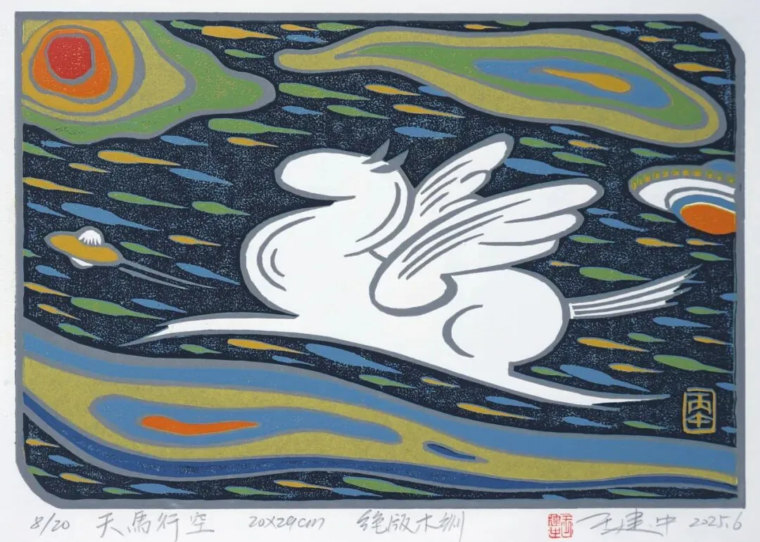 王建中《天马行空》绝版木刻 20×29cm 2025年
