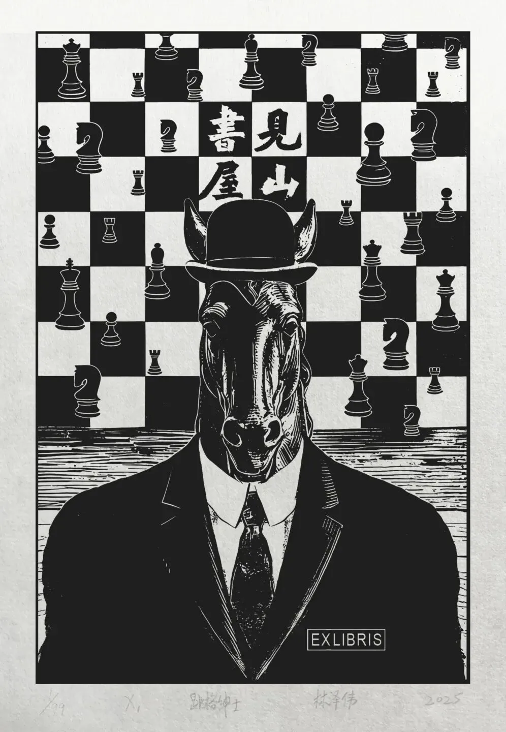 作品以马首人身的“跳格绅士”为核心,结合国际象棋棋盘的博弈符号,以黑白版画的冷峻风格,借超现实手法隐喻现代社会的规则博弈、个体身份异化,也凸显书籍作为精神博弈与自我找寻的空间价值。