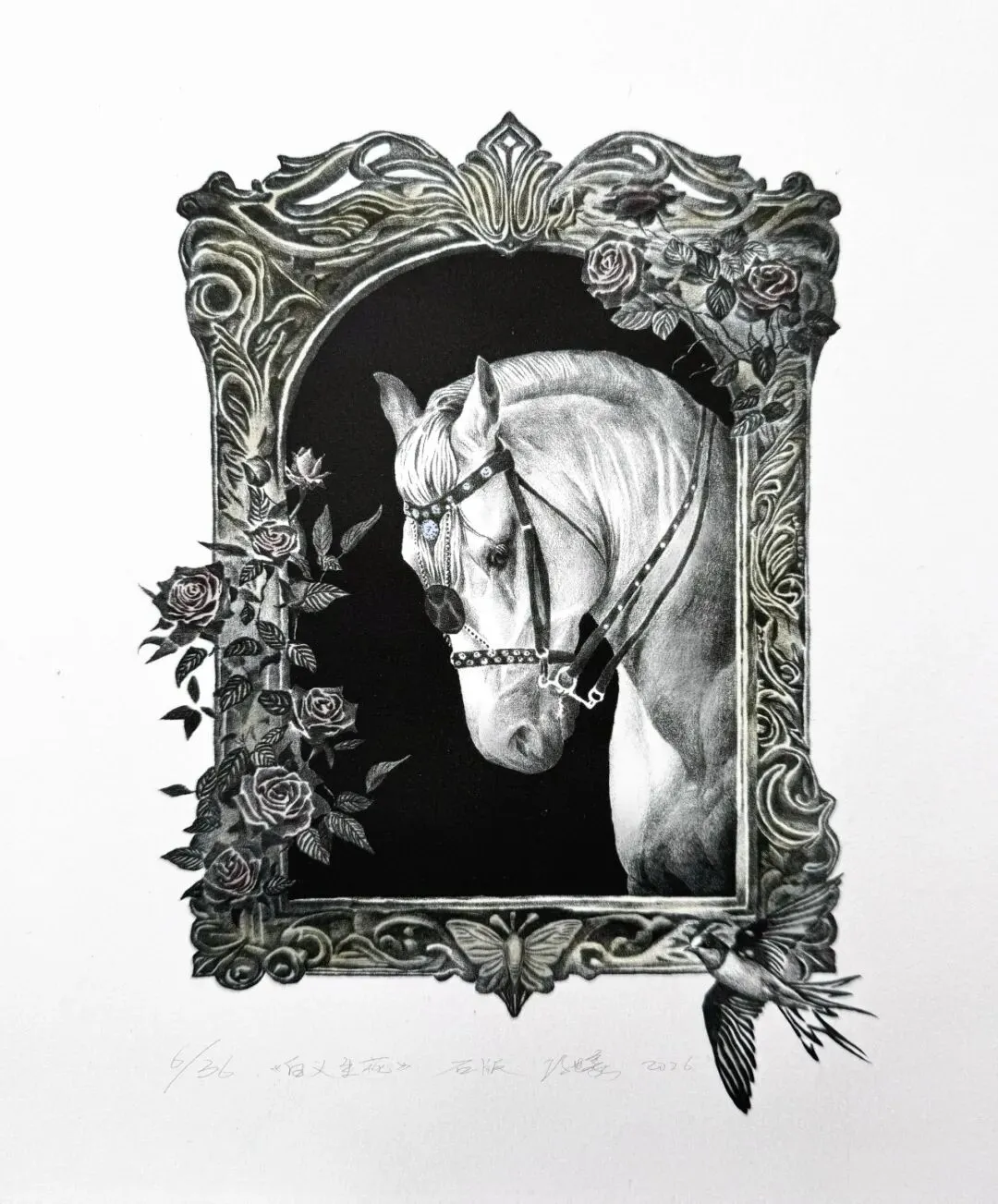 作品为石版画创作,画中以白马为主题融入古典油画框,在重色背景的衬托下凸显白马独特气质,增添了画面的神秘感,细节上增加了花朵枝蔓与飞鸟作为点缀,使画面更生动,也有蓬勃生机的美好寓意。