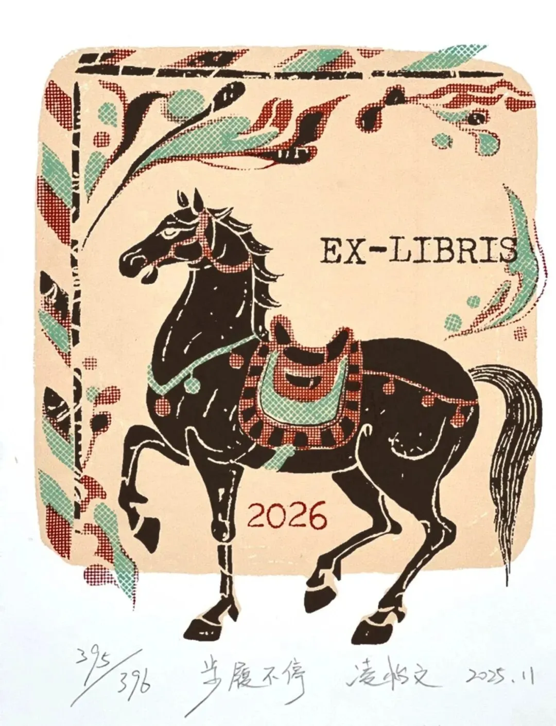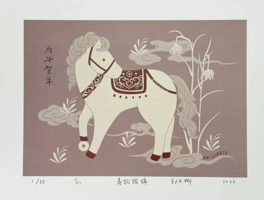 辞旧迎新,步履不停。这是一幅为马年制作的藏书票,参考了魏晋马纹瓷图样,描绘了一匹姿态昂扬的骏马。整体用丝网版画的方式制成,希望用当代语言再现传统意象,将魏晋艺术的古拙风骨与现代数字绘画相结合,希望未来的路上我们都能够步履不停,勇敢往前走,不回头。