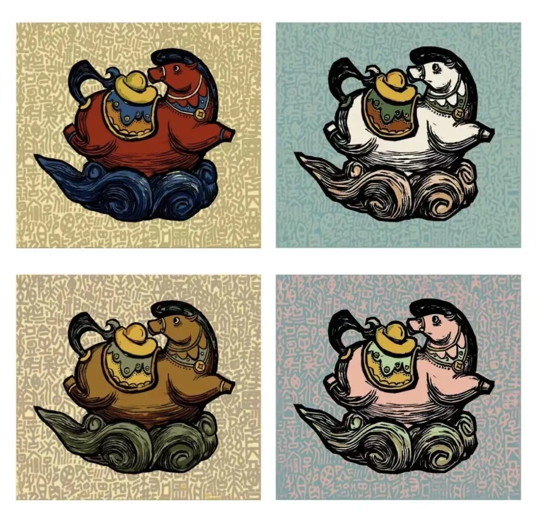 这是一组马年主题的版画作品,以木刻质感呈现:主体是装饰着华丽鞍具的卡通小马,姿态活泼,身下衬着传统祥云纹样;作品做了四种配色版本,背景搭配带有纹理的复古底纹(木质感/几何纹样),整体风格既保留传统祥瑞元素,又带有轻松的卡通感,适合作为节日装饰类作品。