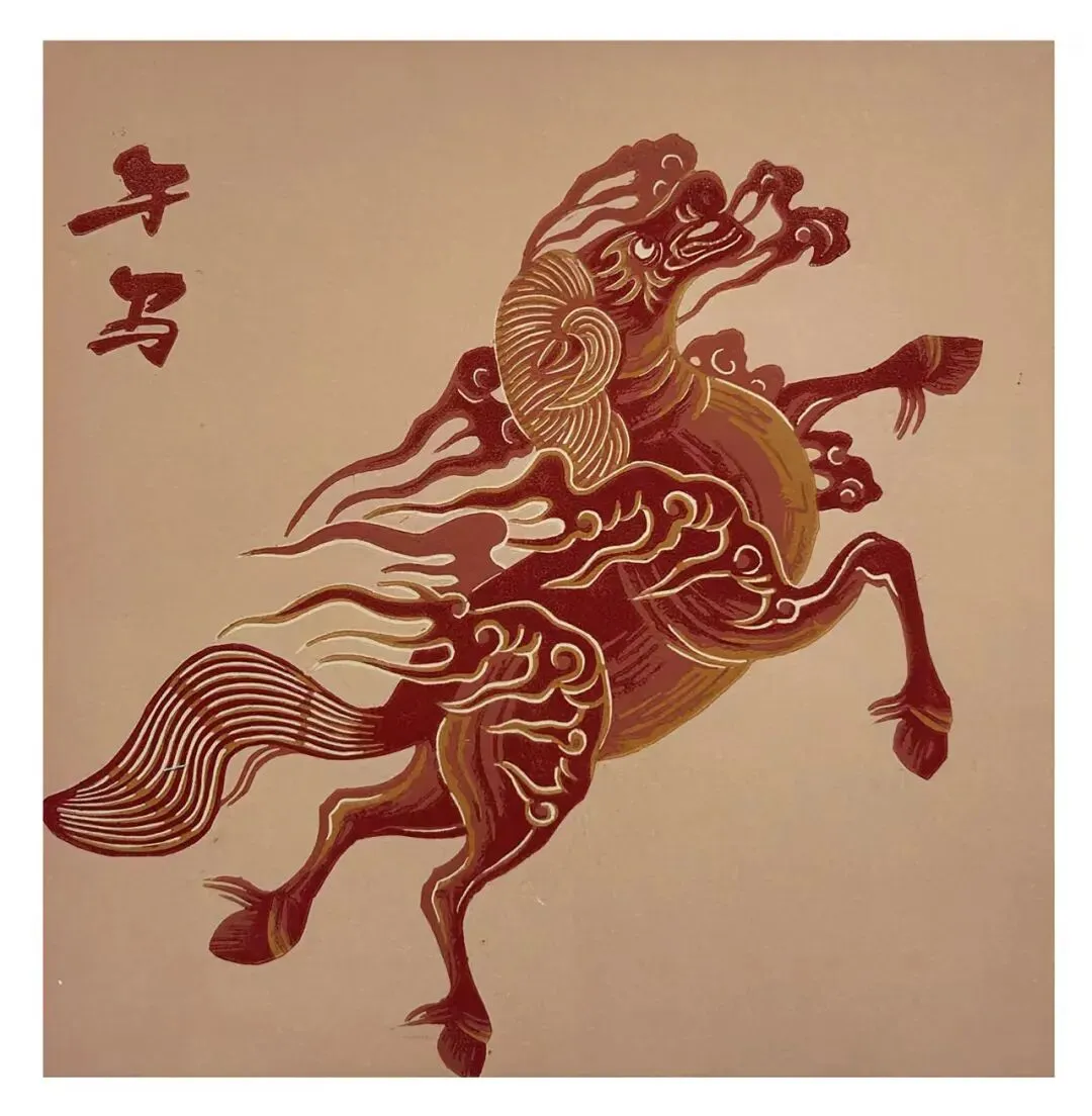 创作这幅皮影火马版画时,我想把传统皮影的线条感与马年的活力结合起来。马的火焰纹样不仅是为了呼应“火马”的形象,更是为了赋予它热烈、奔腾的生命力。我特意用了红金的色调,让它既有皮影的质朴感,又带着马年的喜庆。画中的“午马”二字,是为了让这份传统寓意更直接地融入画面,希望这幅作品能传递出对马年“一马当先”的美好期盼。