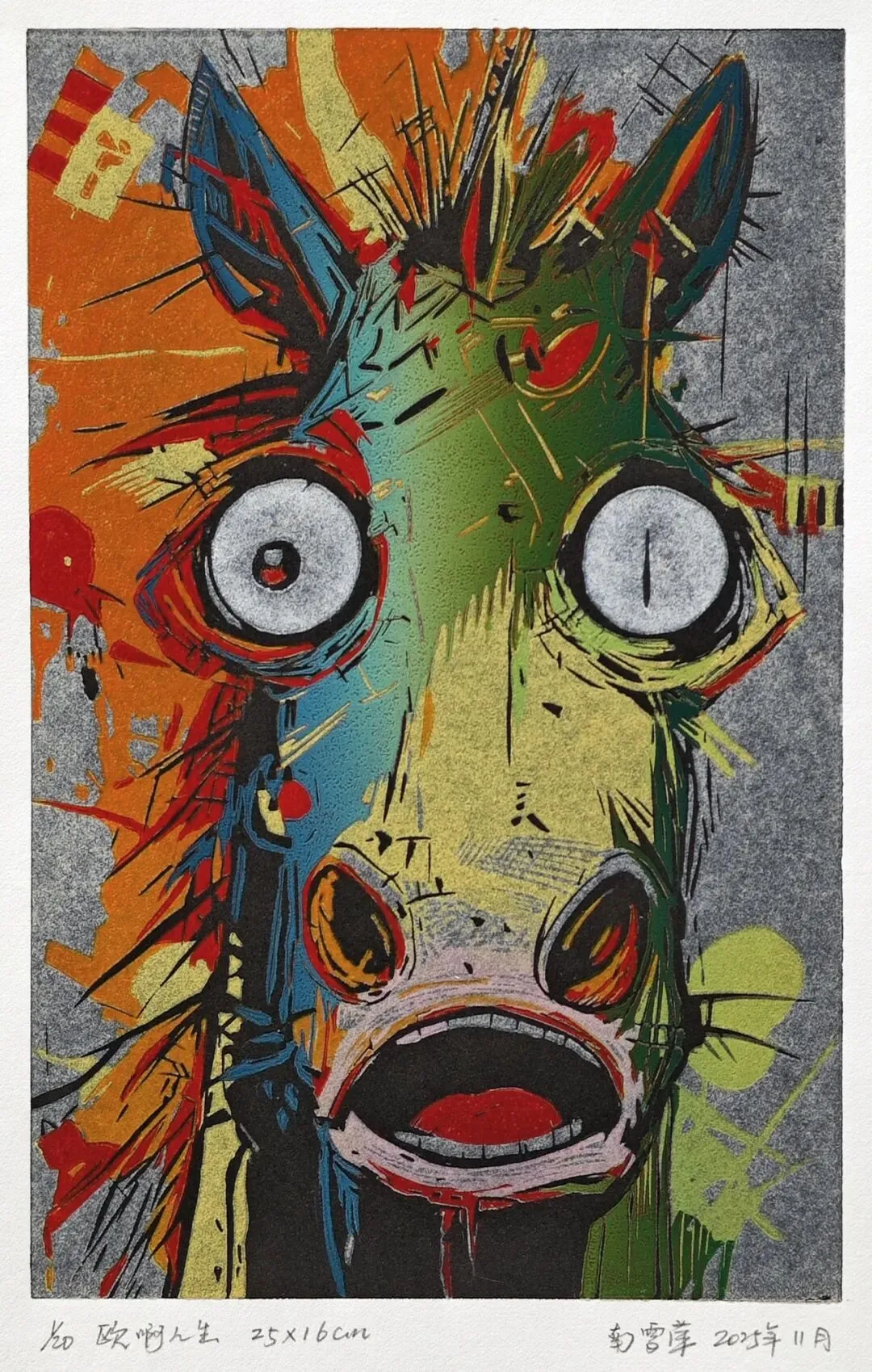 作品用木刻、绝版油套印制而成,贺丙午马年。略为拉长变形的马脸作为画面主体,结合黄梅戏女附马头饰的花簇等传统纹样,既手绘的松弛随性,又有传统美学的装饰感,形成视觉反差的艺术表现追求。